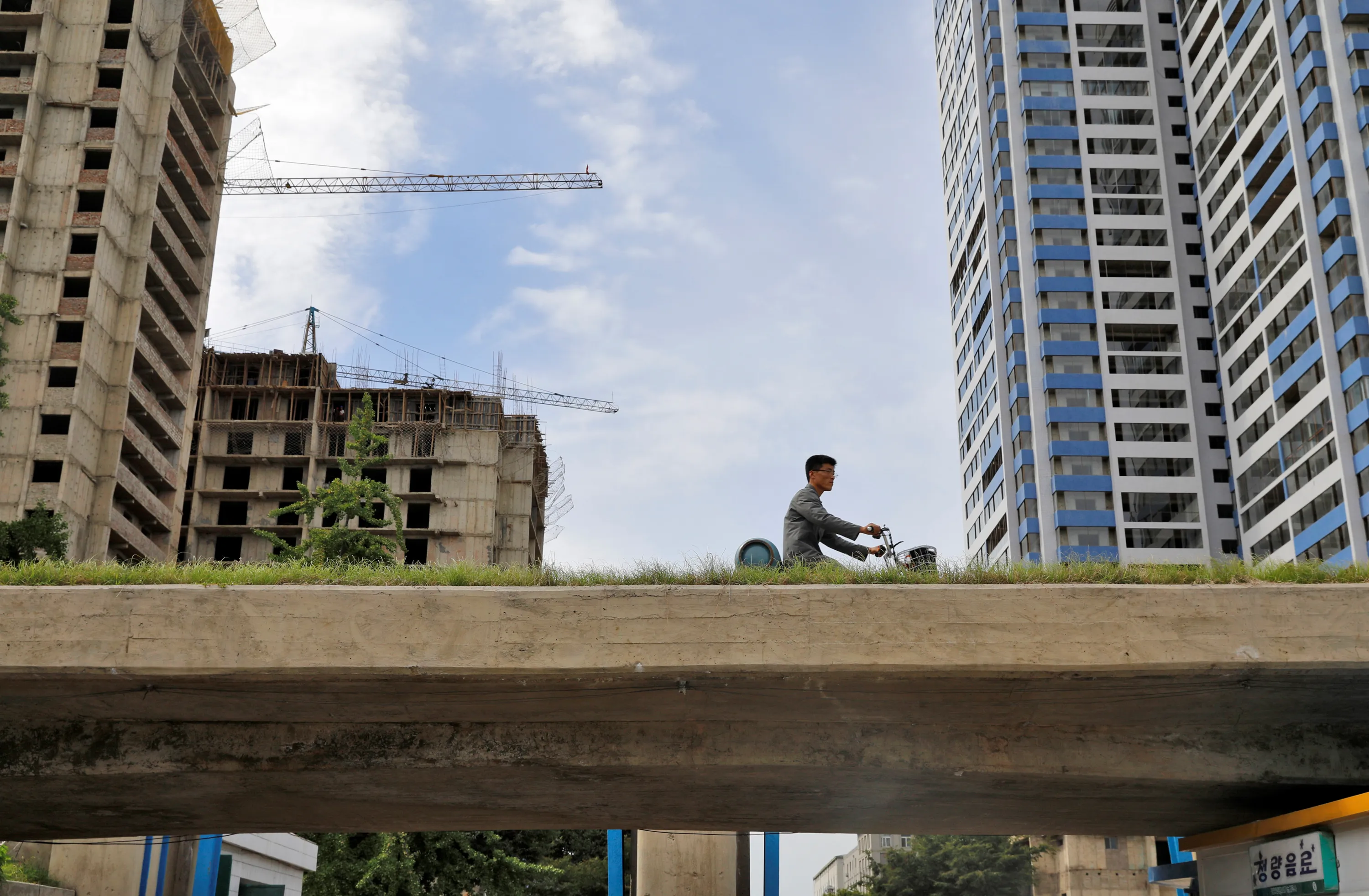 A man rides past residential buildings in Pyongyang, North Korea, September 12, 2018. (Photo by Danish Siddiqui/Reuters)