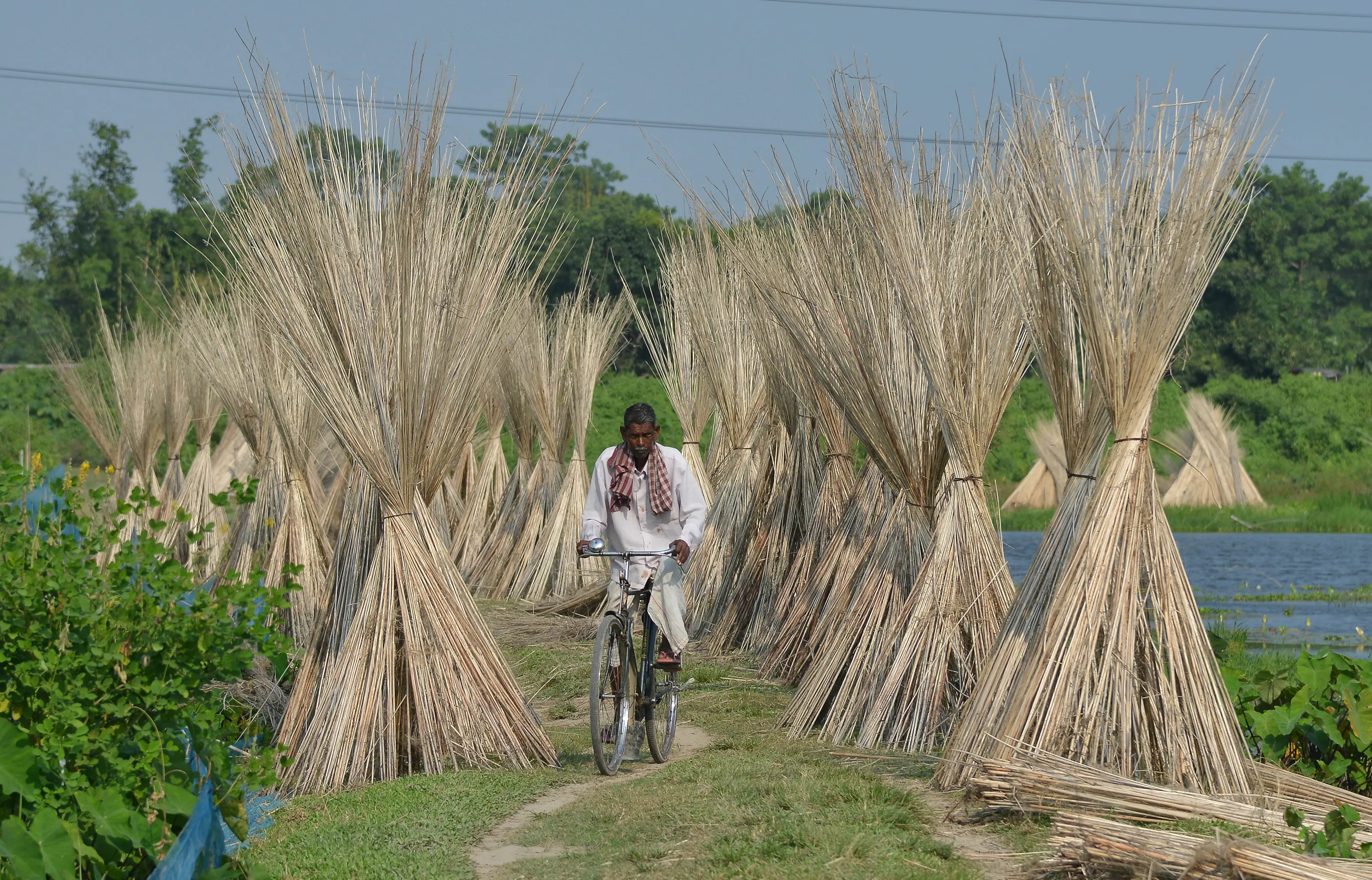 An Indian villagers ride his bicycle past jute sticks, a fibre that can be spun into coarse strong threads, at Dolapani village in Sonitpur district, some 185 kms from Guwahati, the capital city of India's north-eastern state of Assam on October 8, 2018. (Photo by Biju Boro/AFP Photo)