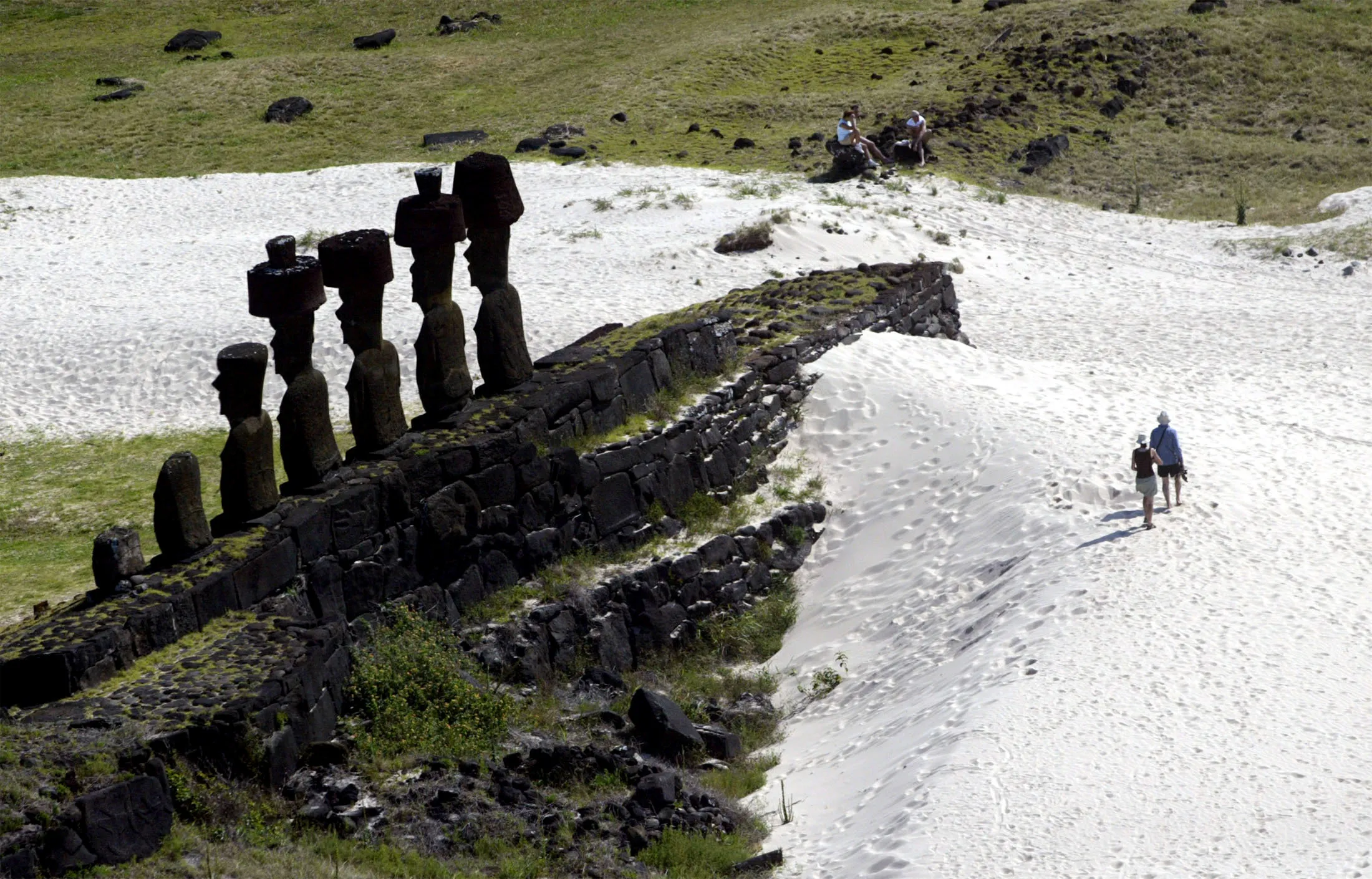 Tourists walk next to “Moai” statues in the Anakena beach on Easter Island, 4,000 km (2486 miles) west of Santiago, October 29, 2003. Easter Island's mysterious “Moai”, gigantic busts carved out of volcanic rock, are in danger of being destroyed by years of tropical rains and wind as well as careless humans and farms animals. Experts have called on the international community to commit funds to preserve the monoliths, whose mystery draws tourists to the world's most remote inhabited island. (Photo by Carlos Barria/Reuters)