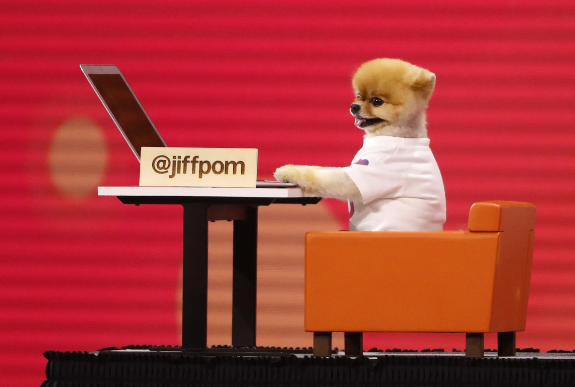 Internet celebrity dog @jiffpom is wheeled on stage during a presentation at Facebook Inc's annual F8 developers conference in San Jose, California, May 1, 2018. (Photo by Stephen Lam/Reuters)