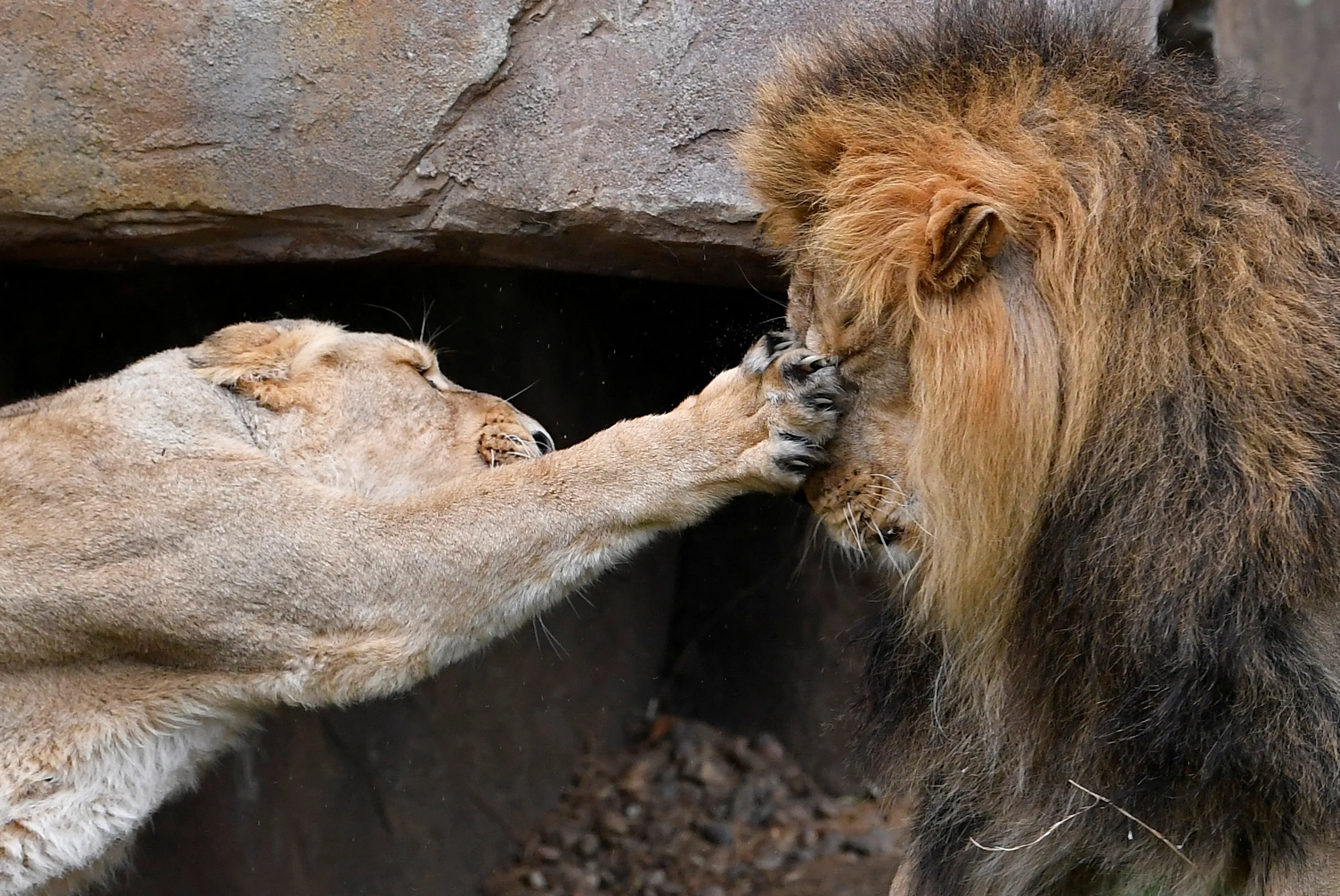 A lioness takes a swipe at Bhanu the Asiatic lion during an event to publicize World Lion Day at London Zoo in London, Britain, August 9, 2018. (Photo by Toby Melville/Reuters)