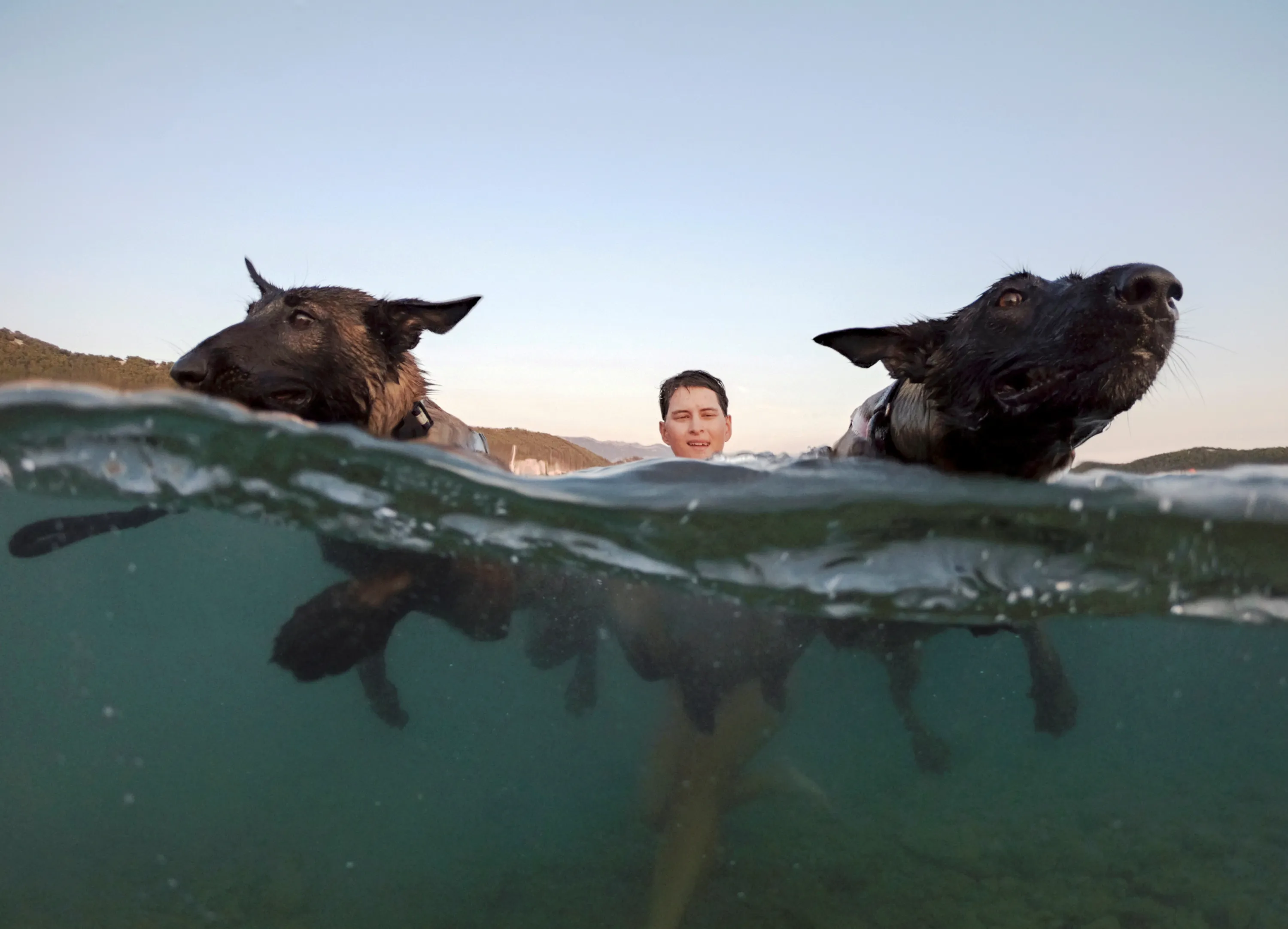 Dogs and their owner take part in the “Underdog 2018” beach race in Banjol, Croatia, August 28, 2018. (Photo by Antonio Bronic/Reuters)