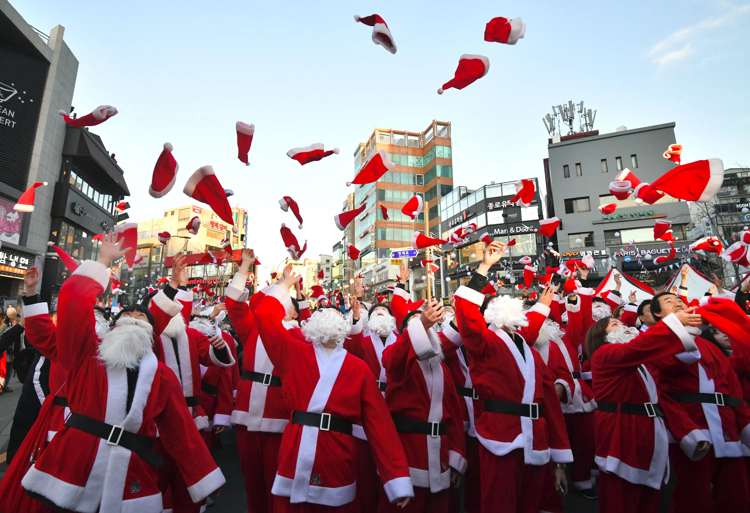 South Korean volunteers in Santa Claus outfits throw Santa hats during a ceremony before the delivery of Christmas gifts in Seoul on December 24, 2018. The volunteers will deliver Christmas gifts to 1,200 kids from 800 poor families in Seoul on Christmas eve. (Photo by Jung Yeon-je/AFP Photo)