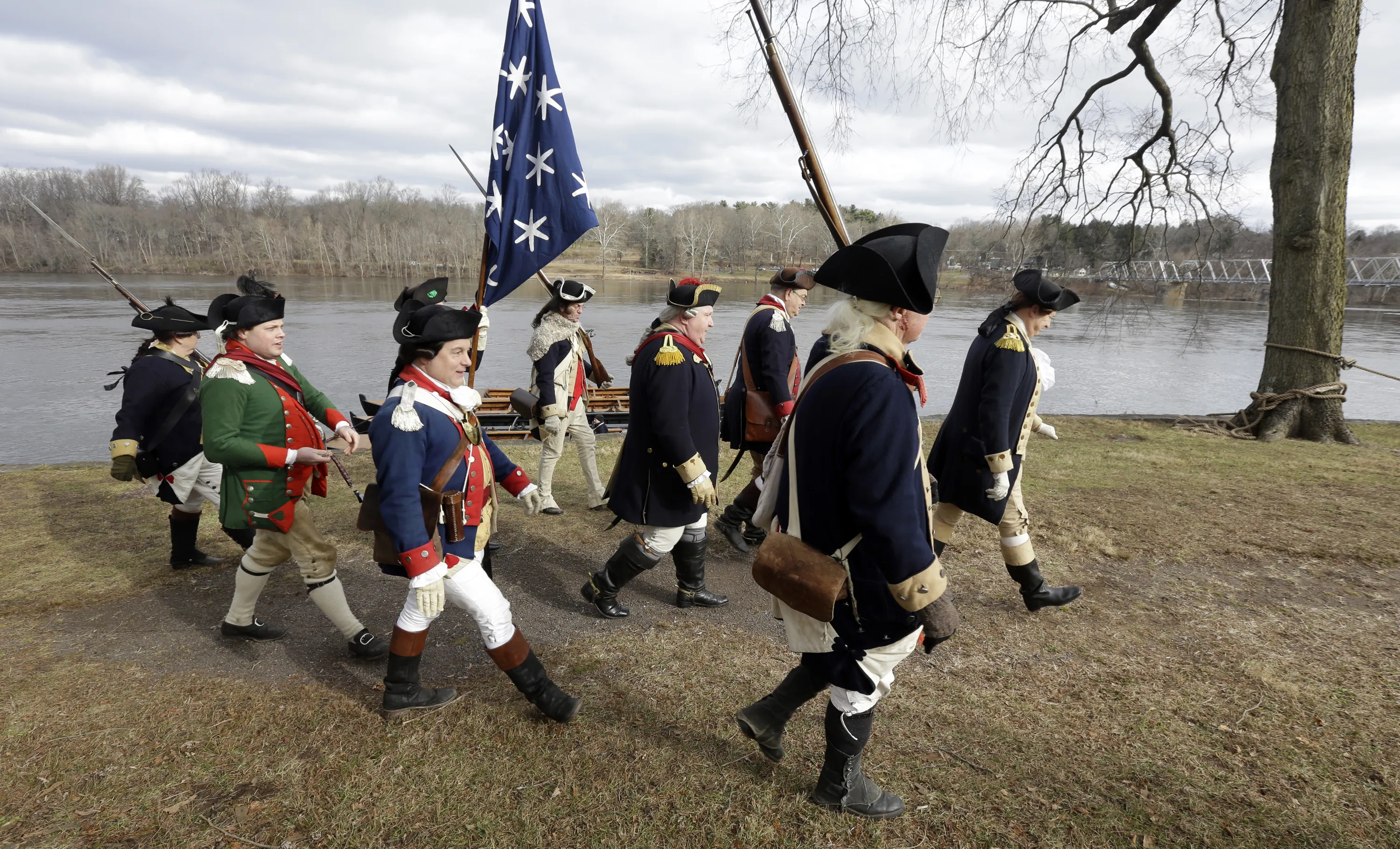 Re-enactor John Godzieba, right, portrays Gen. George Washington as he leads others along the banks of the Delaware River, Tuesday December 25, 2018 in Washington Crossing, Pa. The annual reenactment of George Washington's daring 1776 crossing of the Delaware River on Christmas Day has once again been left high and dry as organizers announced Monday that the river crossing portion of the reenactment will not take place due to high river conditions following recent rainfall. Other activities carried on as scheduled. (Photo by Jacqueline Larma/AP Photo)