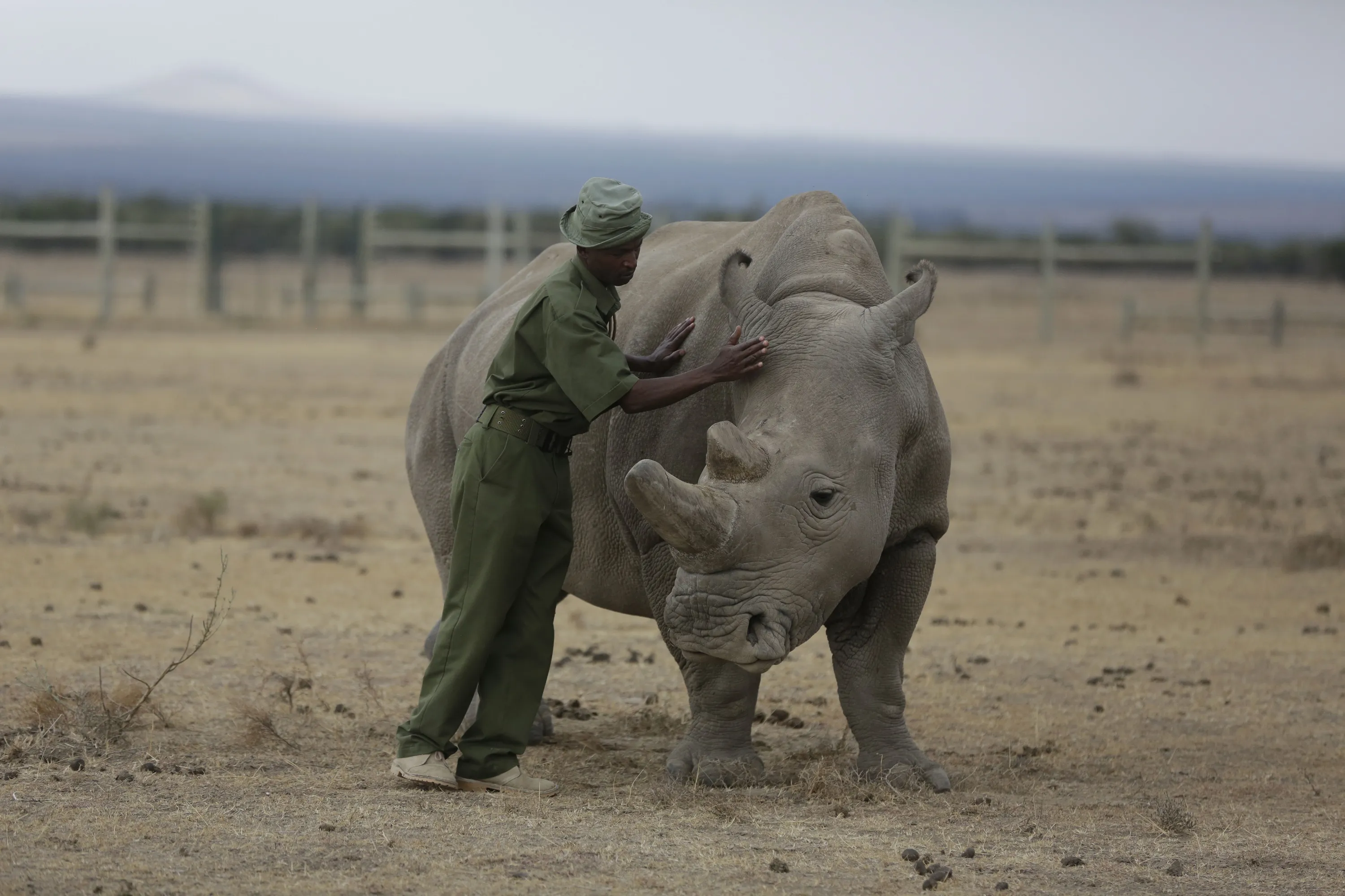 Keeper Zachariah Mutai attends to Fatu, one of only two female northern white rhinos left in the world, in the pen where she is kept for observation, at the Ol Pejeta Conservancy in Laikipia county in Kenya March 2, 2018. The health of the sole remaining male northern white rhino, 45-year-old Sudan who also lives at Ol Pejeta, is deteriorating and his minders said Thursday that his “future is not looking bright”. (Photo by Sunday Alamba/AP Photo)