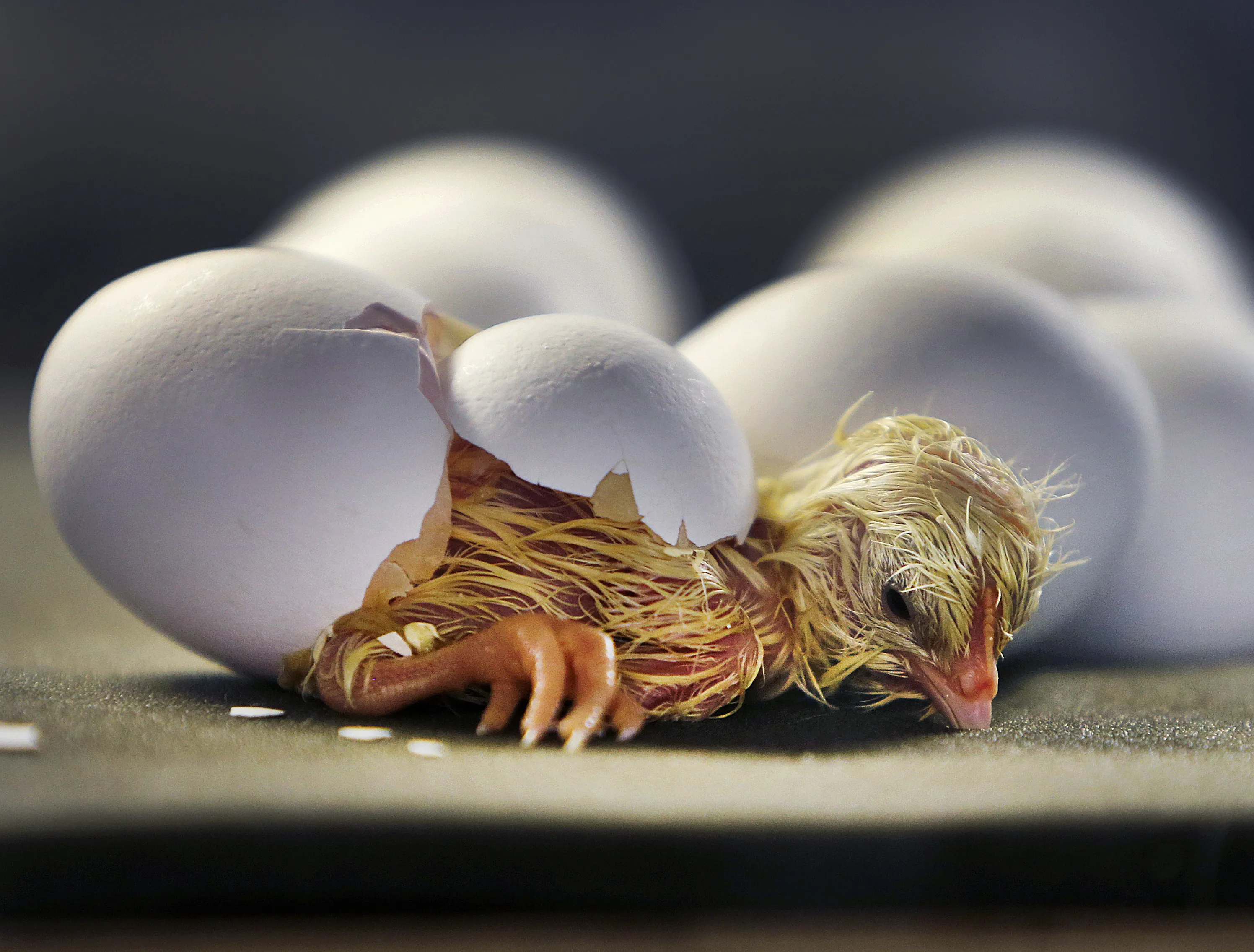 A freshly hatched chick rest after strong efforts to break through the egg in the zoo in Frankfurt, Germany, January 23, 2018. (Photo by Michael Probst/AP Photo)