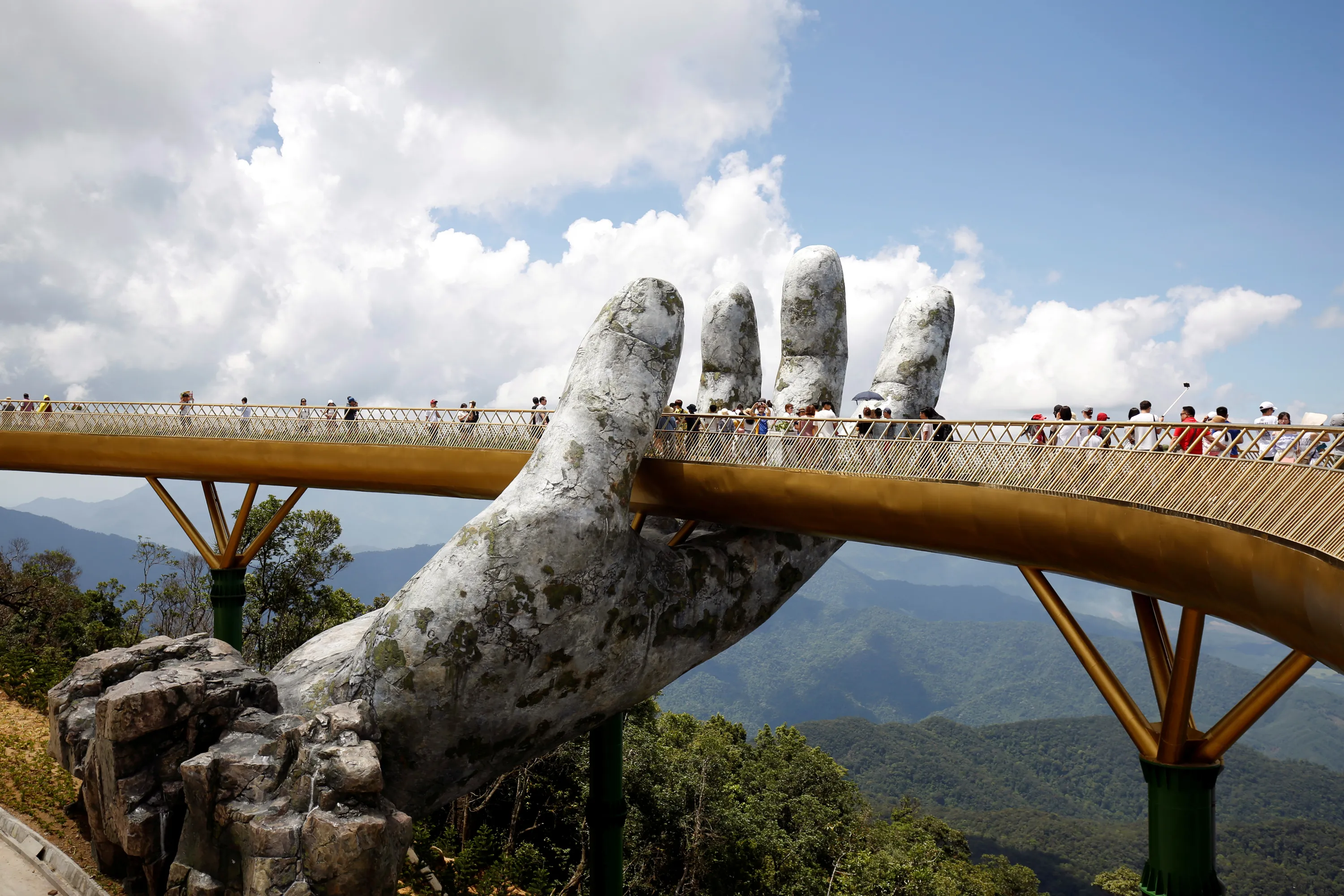 Tourists walk past a giant hand structure on the Gold Bridge on Ba Na hill near Danang City, Vietnam August 1, 2018. (Photo by Reuters/Kham)
