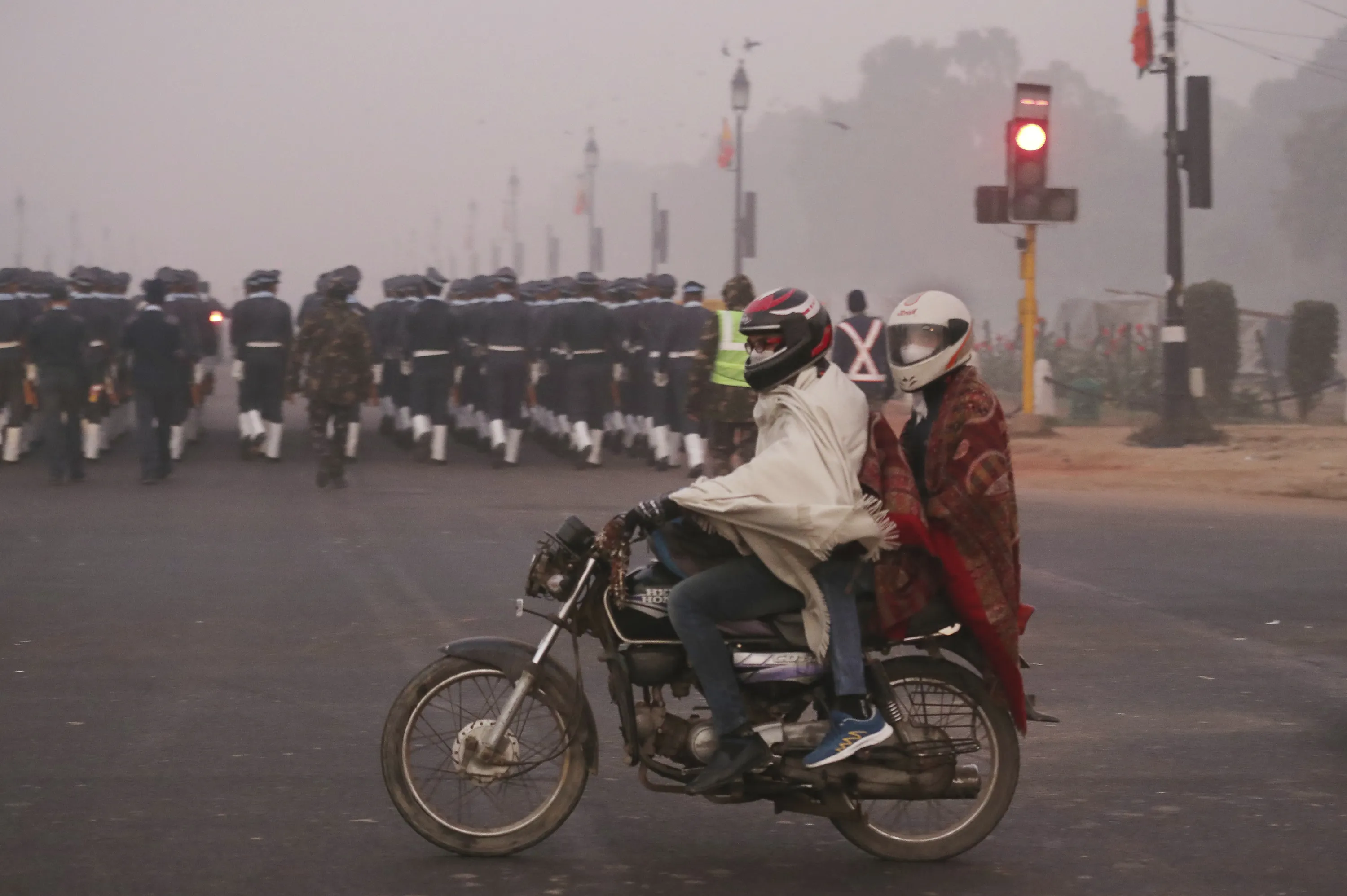 In this Wednesday, December 26, 2018, photo, a motorcyclist rides wearing pollution masks in New Delhi, India. Authorities have ordered fire services to sprinkle water from high rise building to settle dust particles and stop burning of garbage and building activity in the Indian capital as the air quality hovered between severe and very poor this week posing a serious health hazard for millions of people. (Photo by Manish Swarup/AP Photo)
