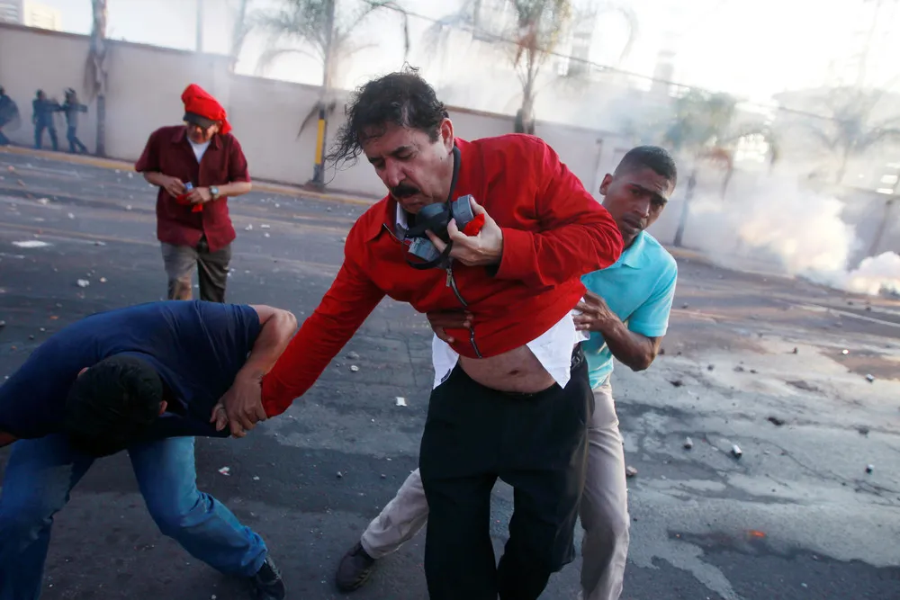 Former President Manuel Zelaya is helped by aides while being overcome by tear gas during a protest against the re-election of Honduras' President Juan Orlando Hernandez in Tegucigalpa, Honduras January 12, 2018. (Photo by Jorge Cabrera/Reuters)
