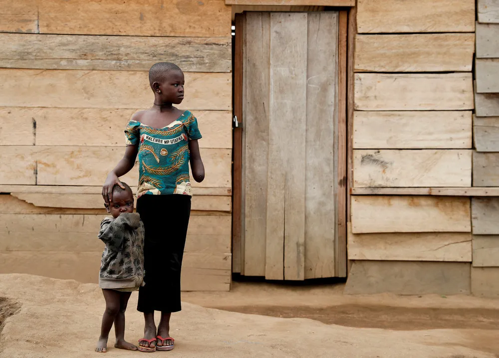 Mave Grace, 11, who had part of her arm chopped off by militiamen when they attacked the village of Tchee, stands with her sister Racahele-Ngabausi, aged two, in an Internally Displaced Camp in Bunia, Ituri province, eastern Democratic Republic of Congo, April 12, 2018. (Photo by Goran Tomasevic/Reuters)