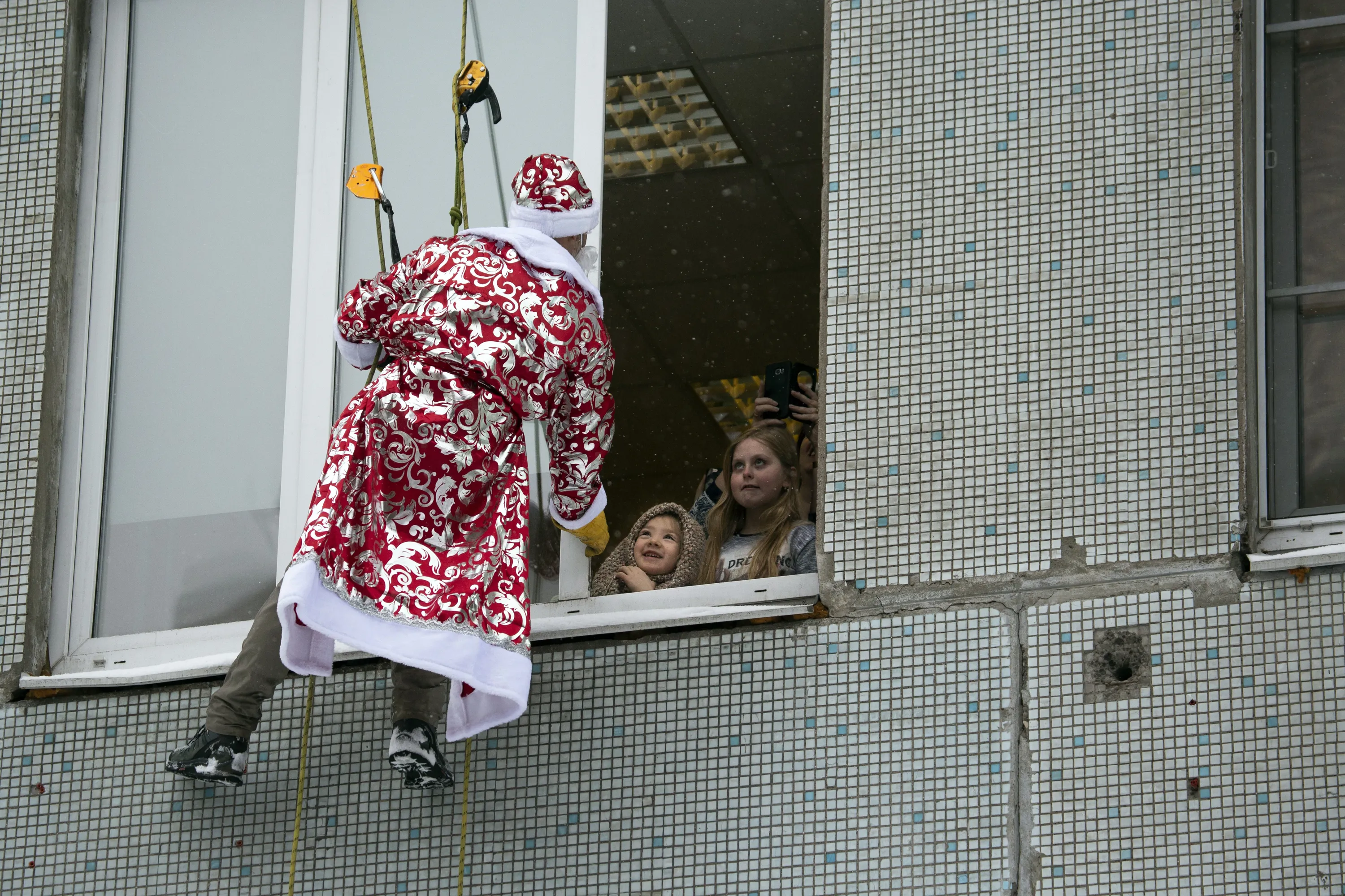 A Russian emergency rescue worker dressed as Ded Moroz (Santa Claus, or Father Frost) greets two girls as he scales the wall of a children hospital in Moscow, Russia, Thursday, December 27, 2018. The action marked the approach of the New Year. (Photo by Alexander Zemlianichenko/AP Photo)