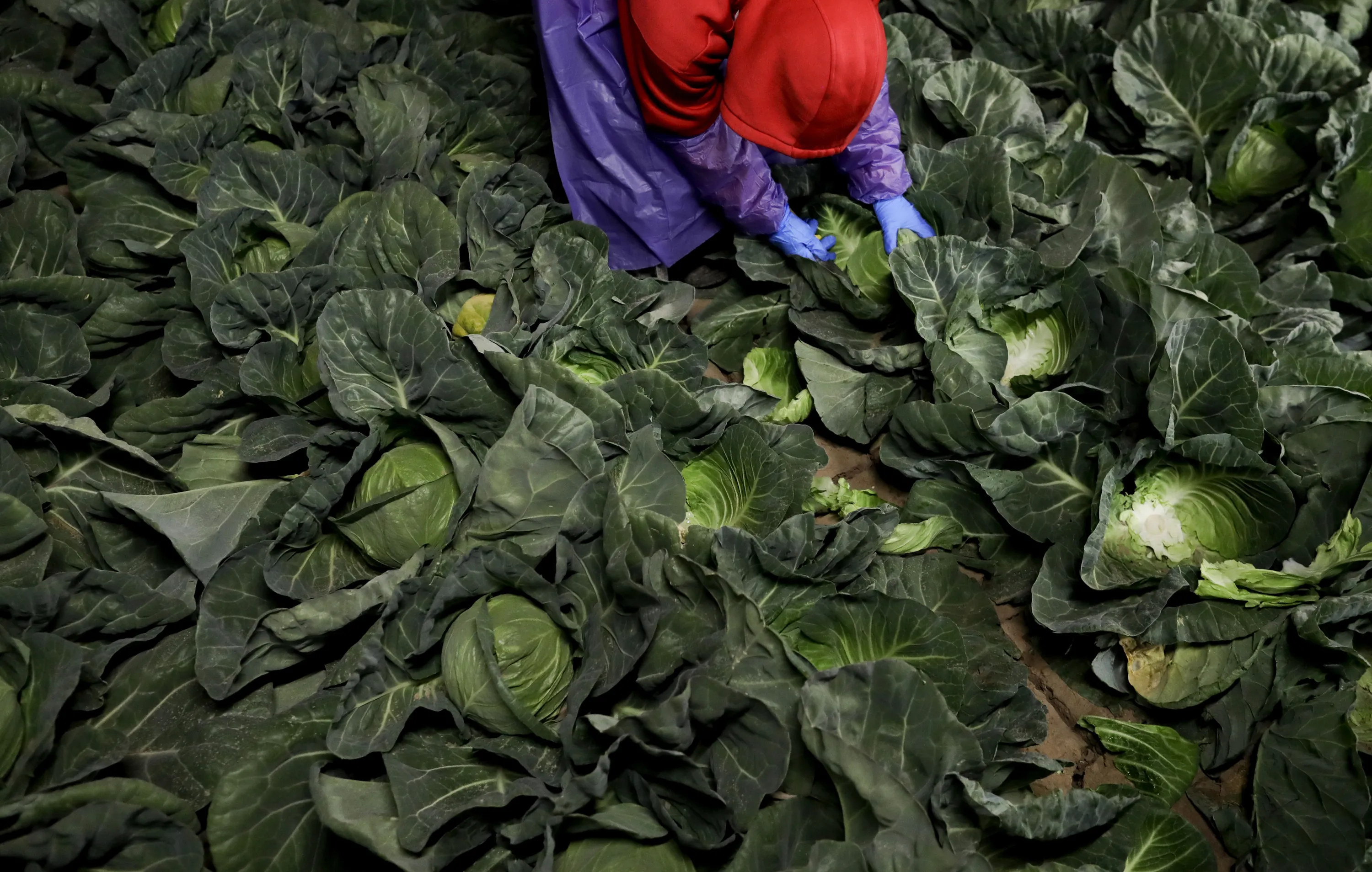 Farmworker Elias Solis, of Mexicali, Mexico, picks cabbage before dawn in a field outside of Calexico, Calif., on March 6, 2018. For decades, cross-border commuters have picked lettuce, carrots, broccoli, onions, cauliflower and other vegetables that make California's Imperial Valley “America's Salad Bowl” from December through March. (photo by Gregory Bull/AP Photo)