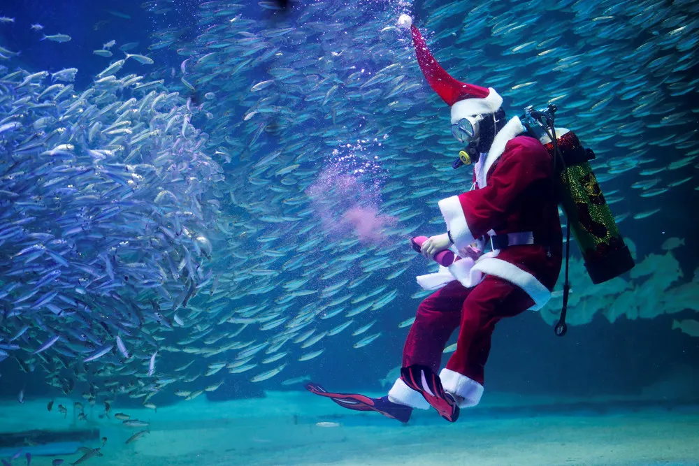 A diver dressed as Santa Claus swims with sardines during a promotional event for Christmas in Seoul, South Korea, December 7, 2018. (Photo by Kim Hong-Ji/Reuters)