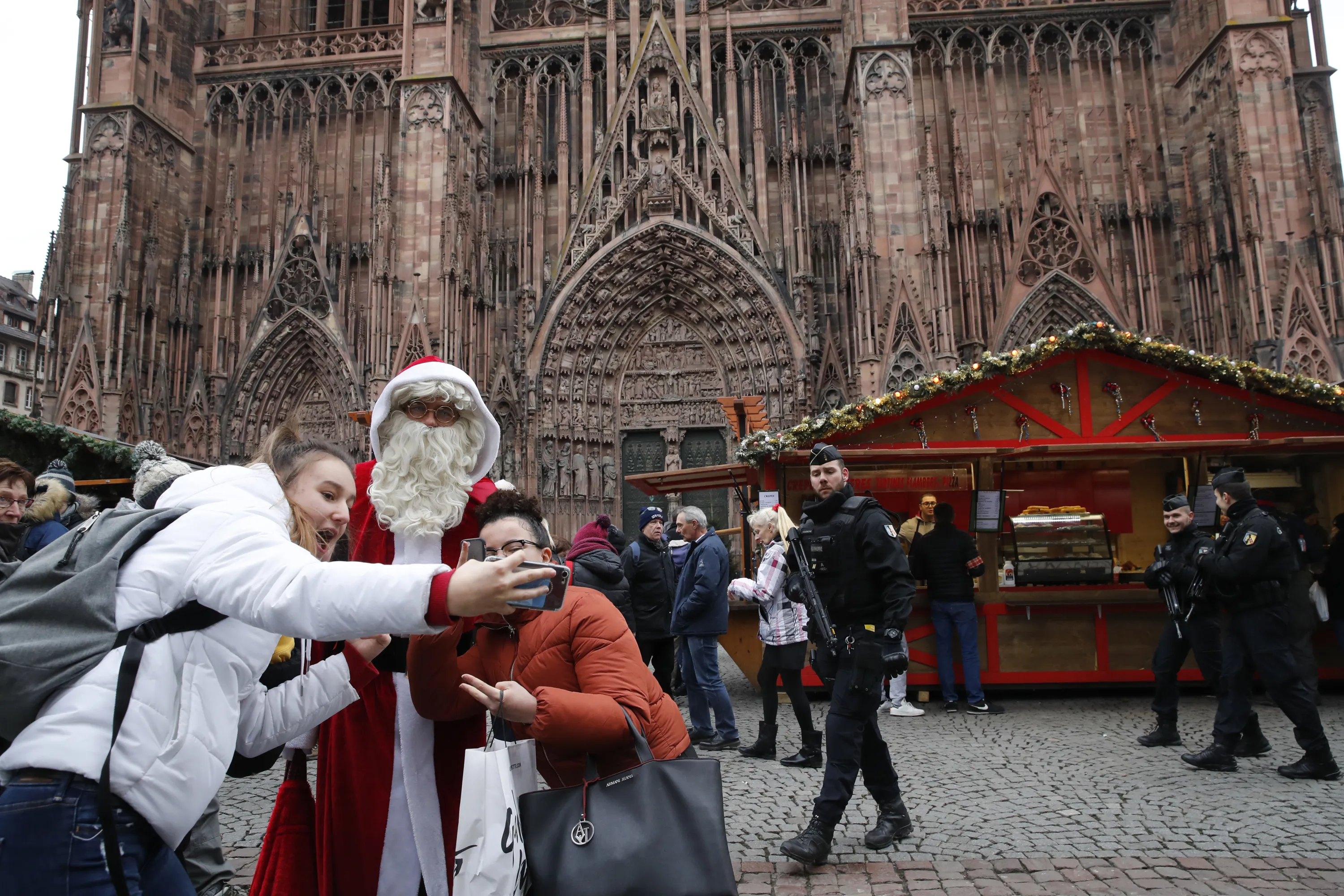 People take a selfie with man dressed like a Santa Claus as police officers patrol outside the cathedral in Strasbourg, eastern France, Friday, December 14, 2018. The man authorities believe killed three people during a rampage near a Christmas market in Strasbourg died Thursday in a shootout with police at the end of a two-day manhunt, French authorities said. (Photo by Christophe Ena/AP Photo)