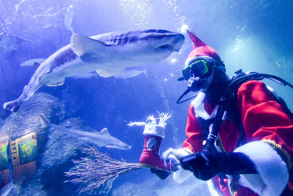 Head aquarist Martin Hansel feeds the fish at Sea Life in Berlin in a Santa Claus costume in the Atlantic basin on December 4, 2018. The food consists of squid. (Photo by Jens Kalaene/dpa-Zentralbild Picture Alliance via Getty Images)