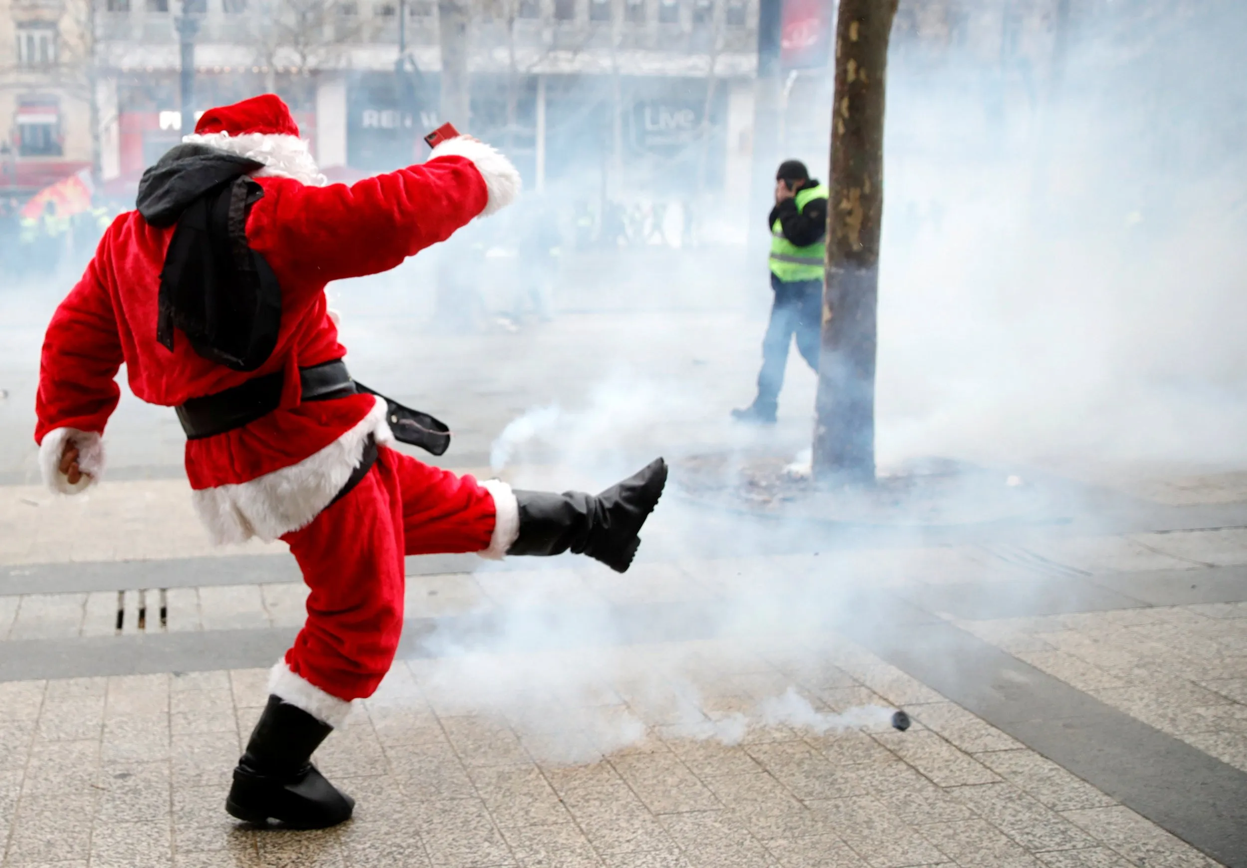 A protester dressed as Santa Claus takes part in a demonstration by the “yellow vests” movement in Paris, France, December 15, 2018. (Photo by Gonzalo Fuentes/Reuters)