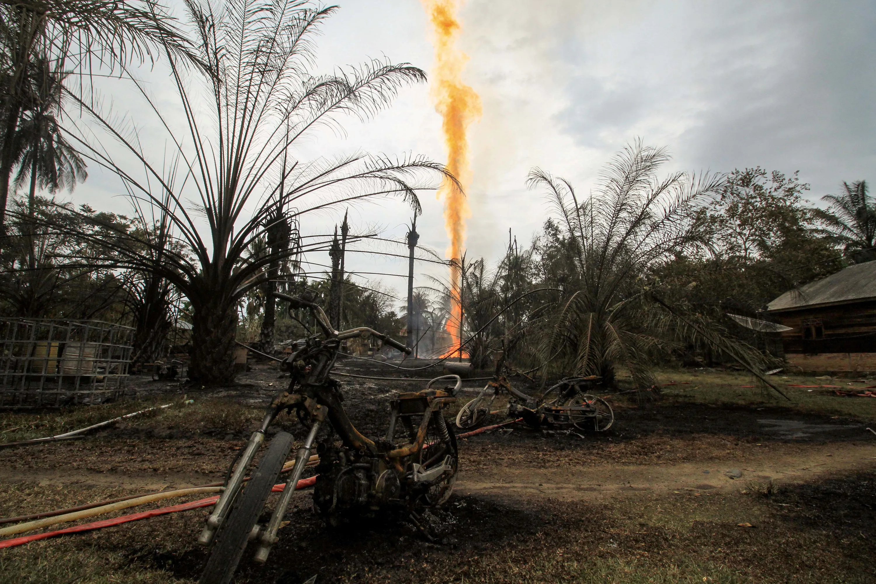 Damage caused by fire from a burning illegal oil well is seen in Ranto Peureulak, Aceh Province, Indonesia, April 25, 2018. (Photo by Rahmad/Antara Foto via Reuters)