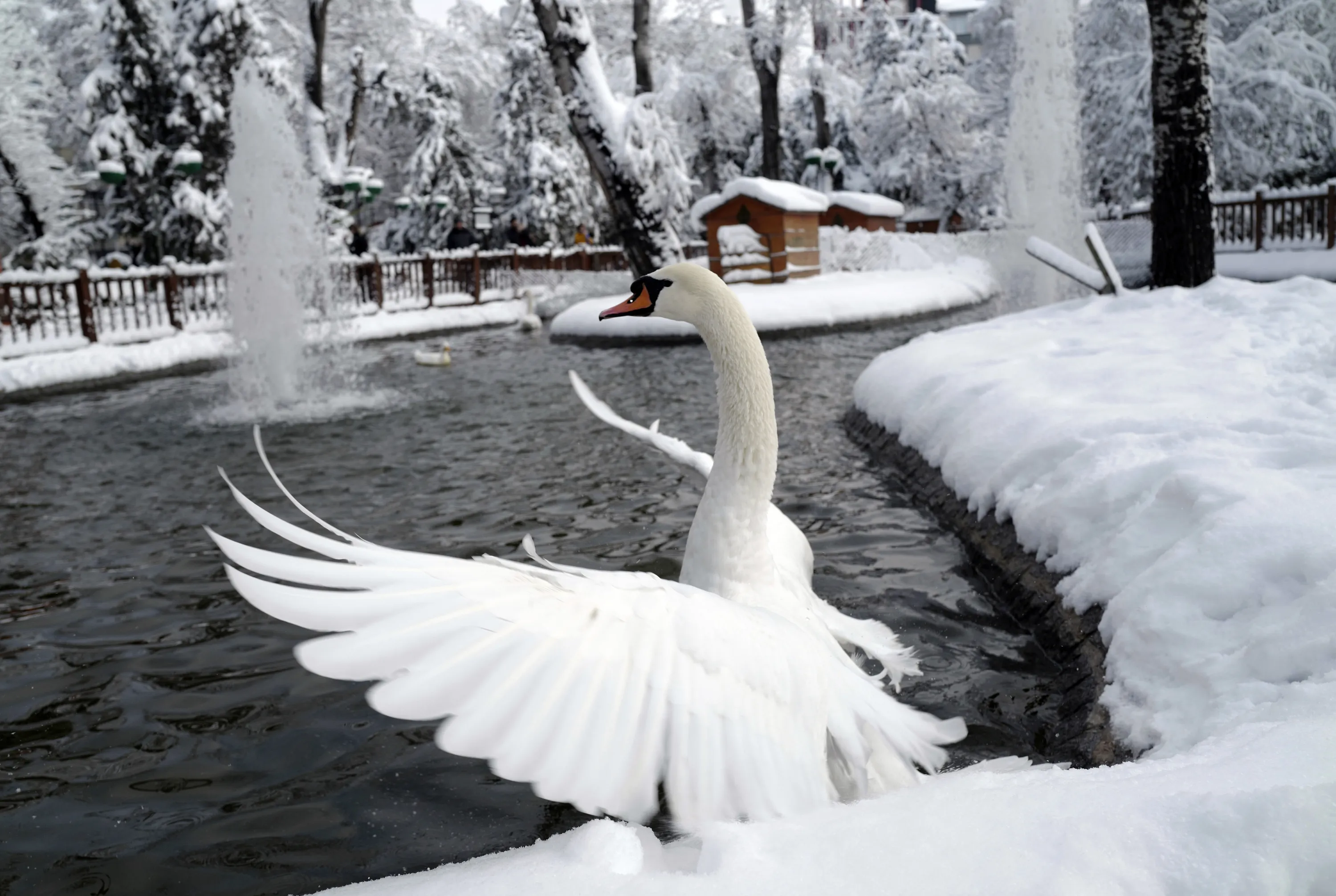 A swan flaps its wings in an icy pond at the Kugulu Park public garden in Ankara, Turkey, Wednesday, December 26, 2016. Winter storms and snowfalls that began Tuesday remains in effect for a large swath of Turkey, damaging trees, causing road accidents and closure of schools in many cities, including Istanbul and Ankara, hours after the snow falls blanketed the country. (Photo by Burhan Ozbilici/AP Photo)
