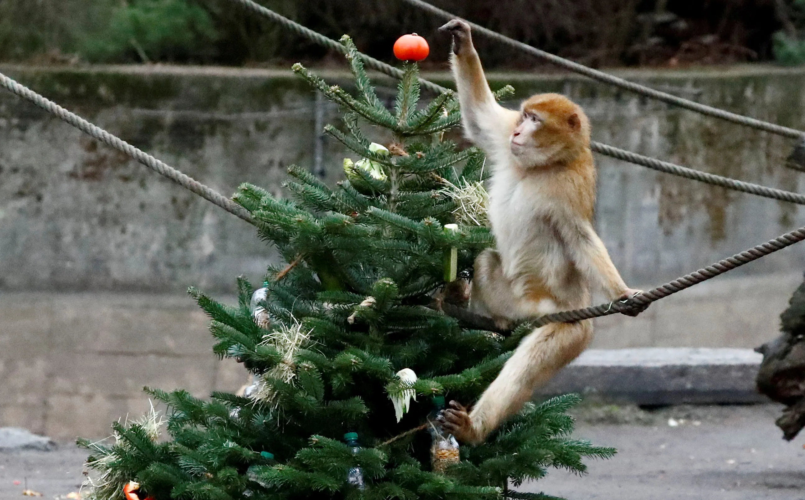 A Barbary macaques plays with leftover Christmas tree in the Tierpark Zoo in Berlin, Germany, January 4, 2019. (Photo by Fabrizio Bensch/Reuters)