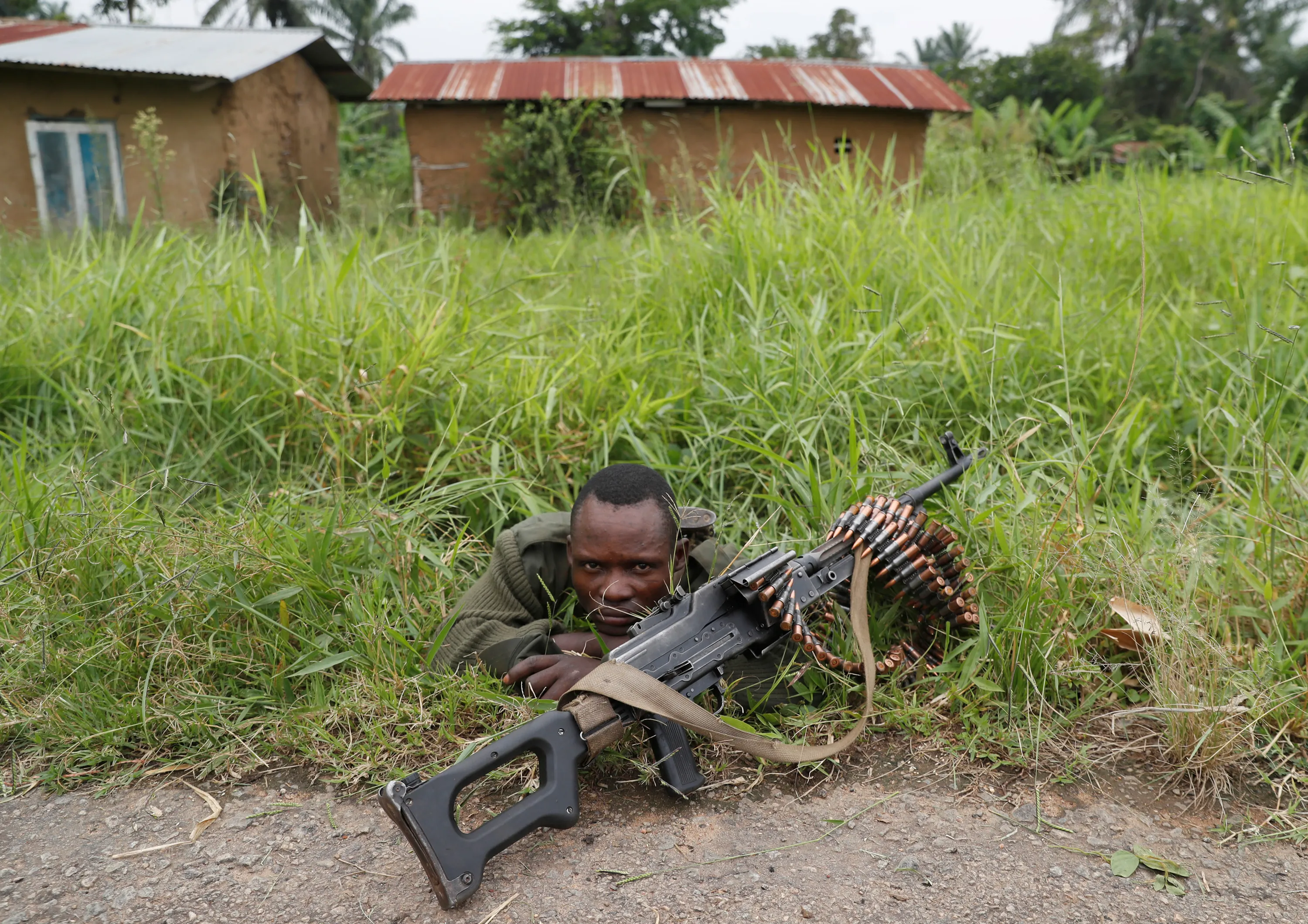 An Armed Forces of the Democratic Republic of the Congo (FARDC) soldier rests next to a road after Islamist rebel group called the Allied Democratic Forces (ADF) attacked area around Mukoko village, North Kivu province of Democratic Republic of Congo on December 11, 2018. (Photo by Goran Tomasevic/Reuters)