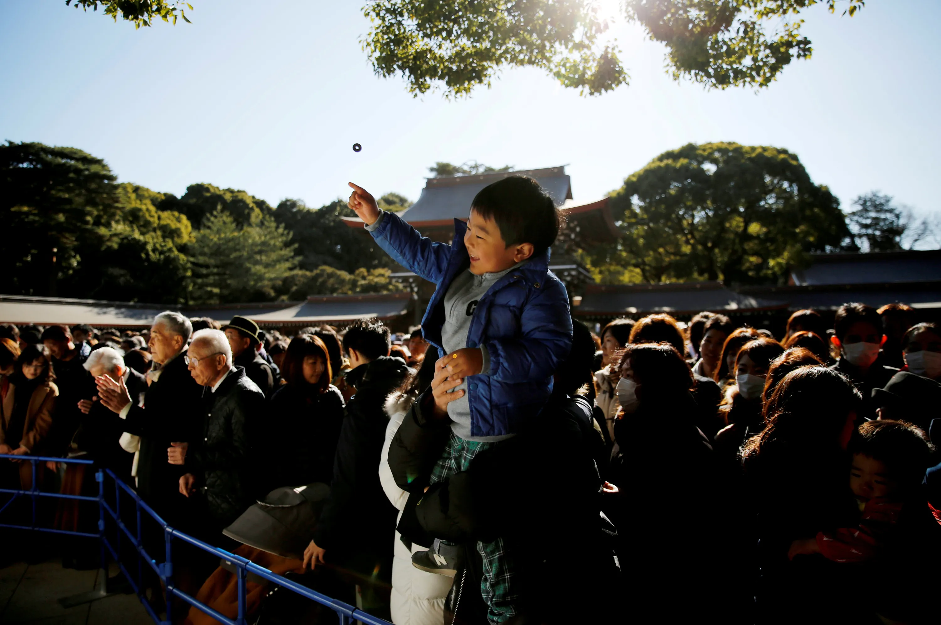 A boy throws a coin as he offers prayers on the first day of the new year at the Meiji Shrine in Tokyo, Japan, January 1, 2019. (Photo by Kim Kyung-Hoon/Reuters)