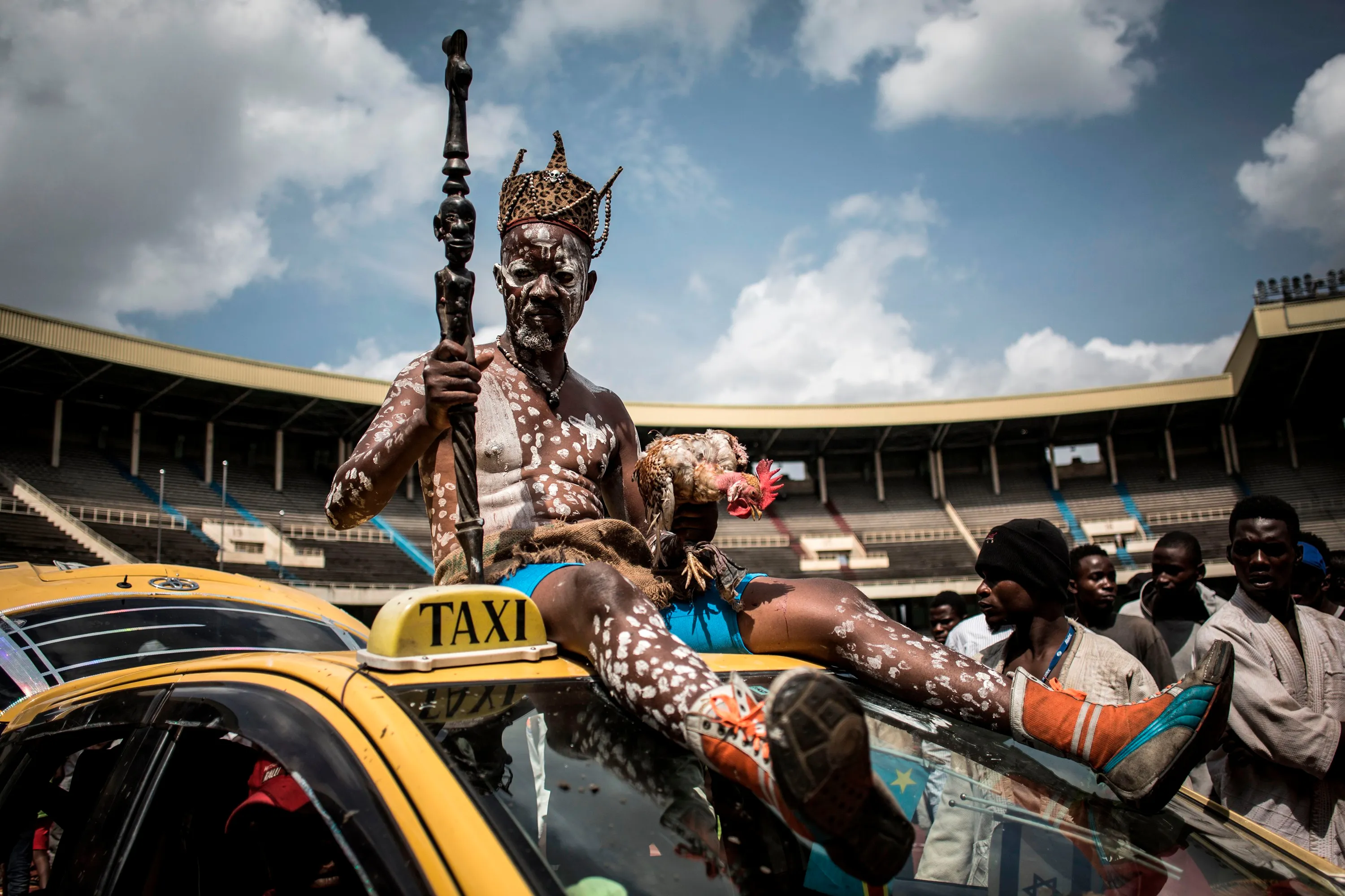 A Congolese wrestler's fetisheur sits on top of a car as he arrives to the Stade De Martyrs for a sports exhibition day on January 8, 2019 in Kinshasa. (Photo by John Wessels/AFP Photo)