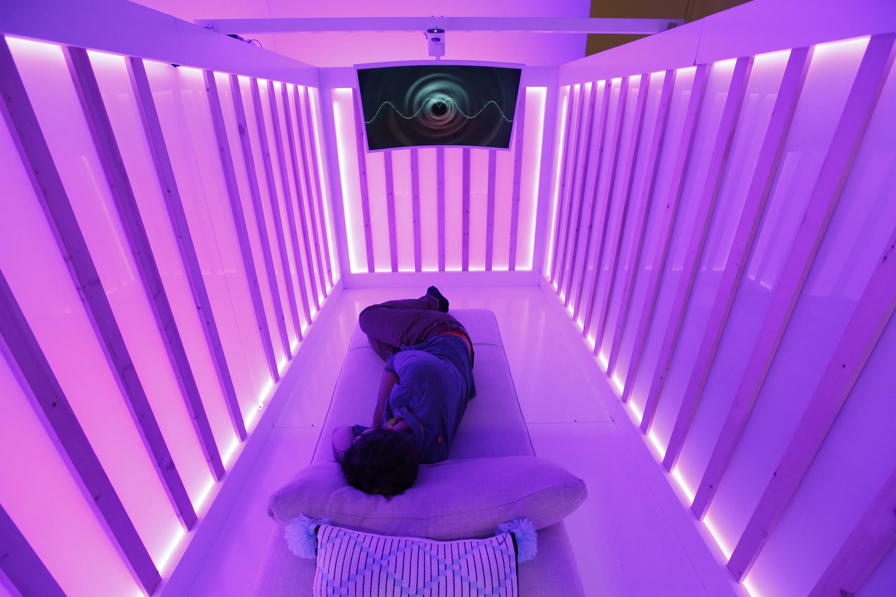 An attendee tests the Miku baby sleep and breathing monitor at the Miku booth at CES International, Wednesday, January 9, 2019, in Las Vegas. (Photo by John Locher/AP Photo)