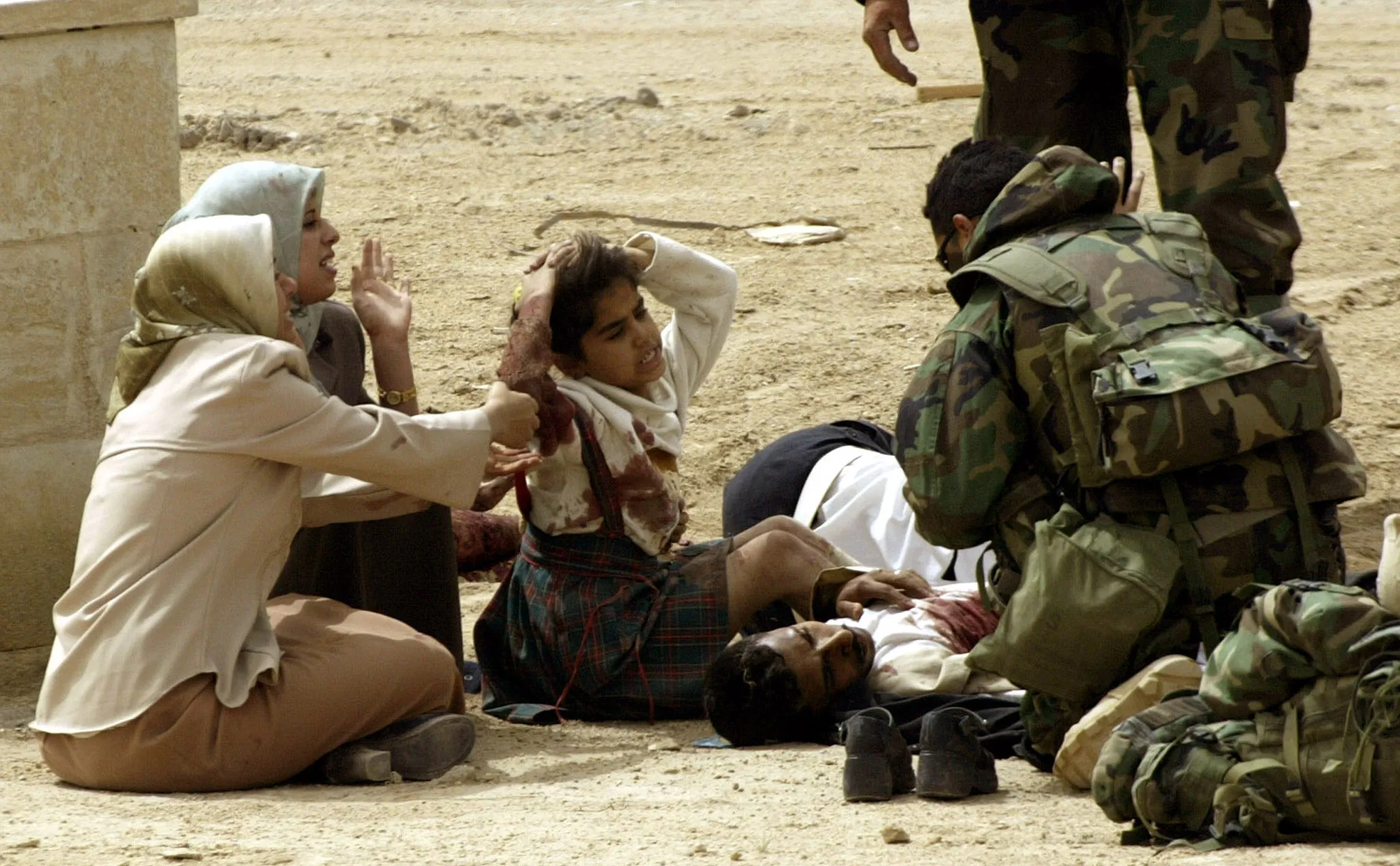 Iraqi civilians caught in crossfire are attended by a medic from the U.S. Marine Expeditionary Unit Fox Company as they push into southern Iraq to take control of the main port of Umm Qasr, March 2003. (Photo by Desmond Boylan/Reuters)