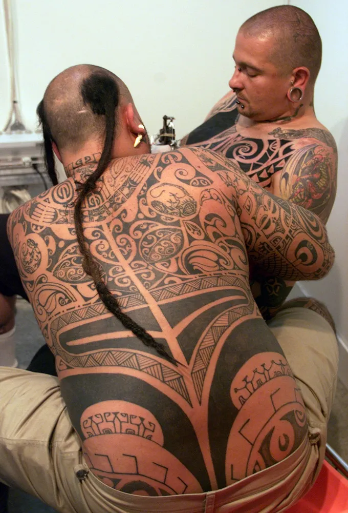 Pua, a tattoo artist from Tahiti, tattoos a man during the opening day of the IV International Tattoo festival in Madrid, June 2001. (Photo by Desmond Boylan/Reuters)