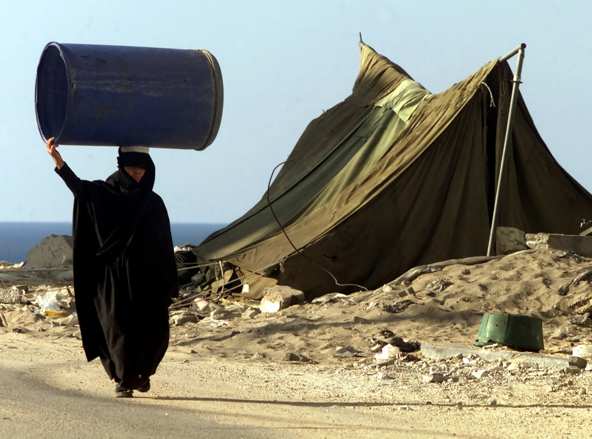 A Palestinian refugee woman carries a water container on her head in the Khan Younis refugee camp near the Kefar Yam Jewish settlement on in the Gaza strip, November 2001. (Photo by Desmond Boylan/Reuters)