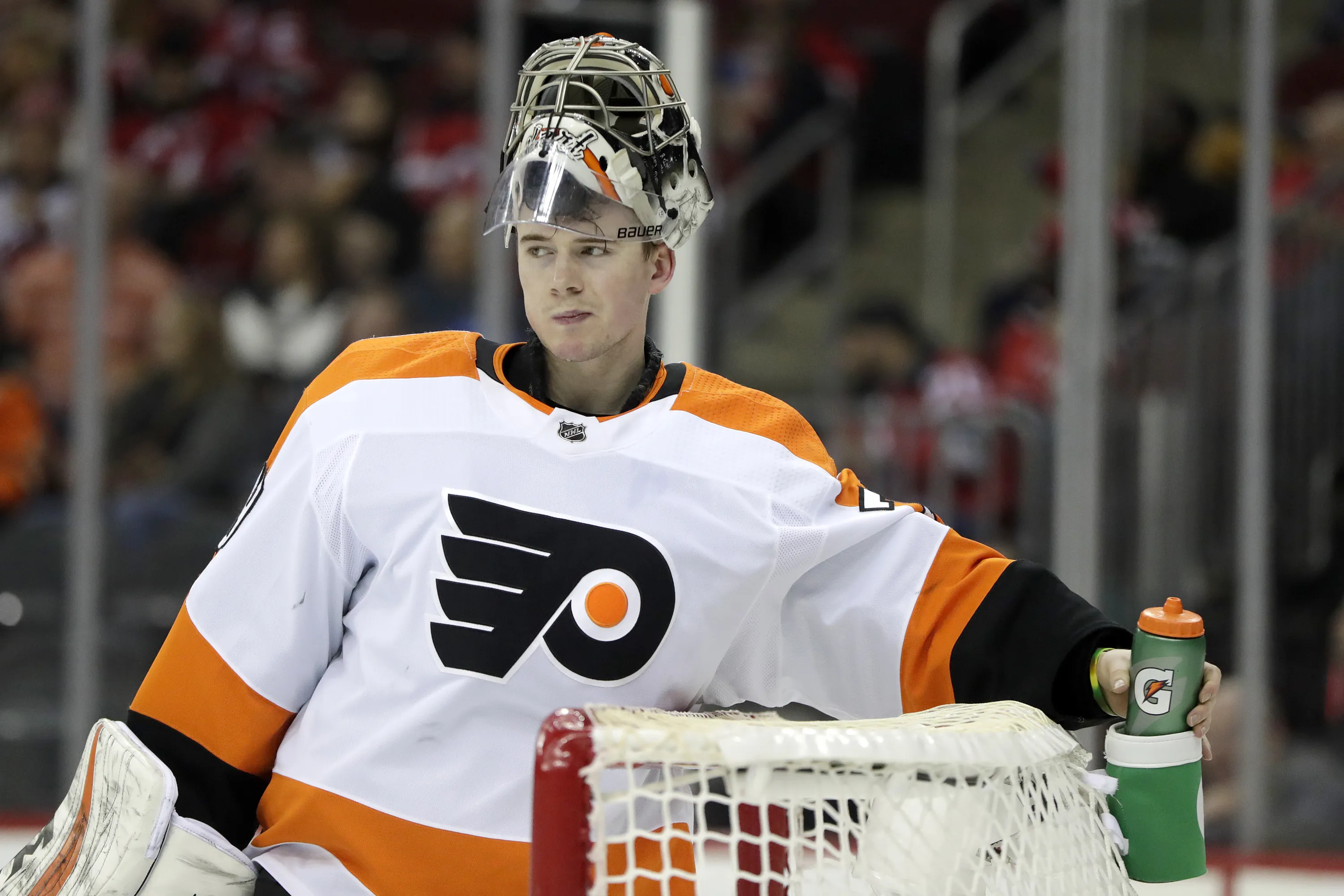 Philadelphia Flyers goaltender Carter Hart grabs his water bottle between plays against the New Jersey Devils during the second period of an NHL hockey game, Saturday, January 12, 2019, in Newark, N.J. (Photo by Julio Cortez/AP Photo)