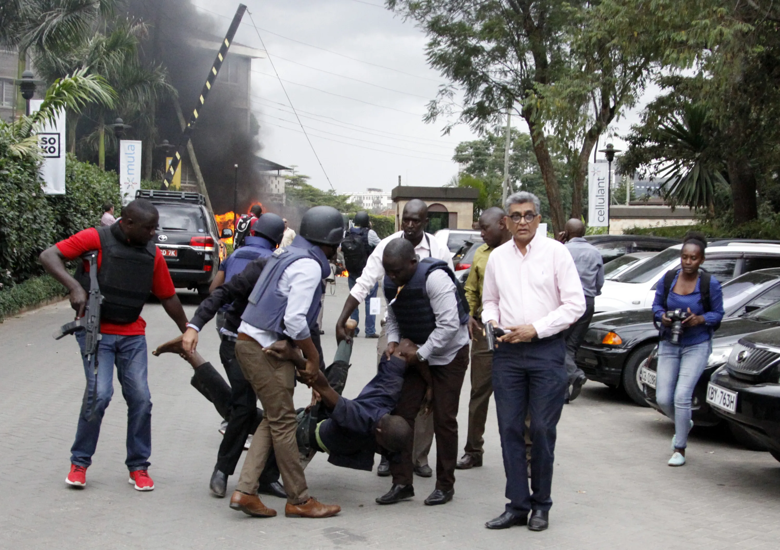 Security forces help a man at the scene of a blast in Nairobi, Kenya Tuesday, January 15, 2019. Terrorists attacked an upscale hotel complex in Kenya's capital Tuesday, sending people fleeing in panic as explosions and heavy gunfire reverberated through the neighborhood. (Photo by Khalil Senosi/AP Photo)