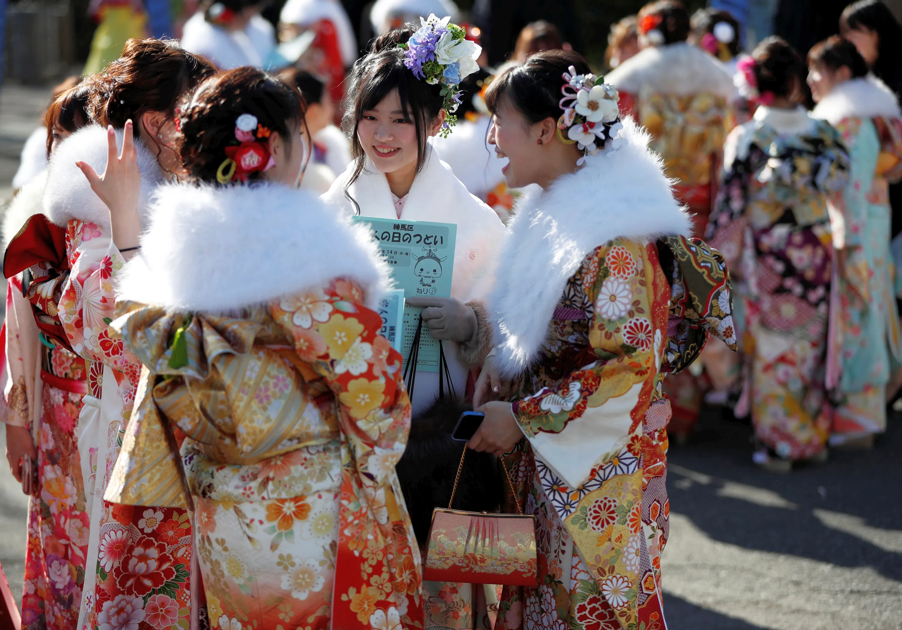 Japanese women wearing kimonos attend their Coming of Age Day celebration ceremony at Toshimaen amusement park in Tokyo, Japan on January 14, 2019. (Photo by Issei Kato/Reuters)