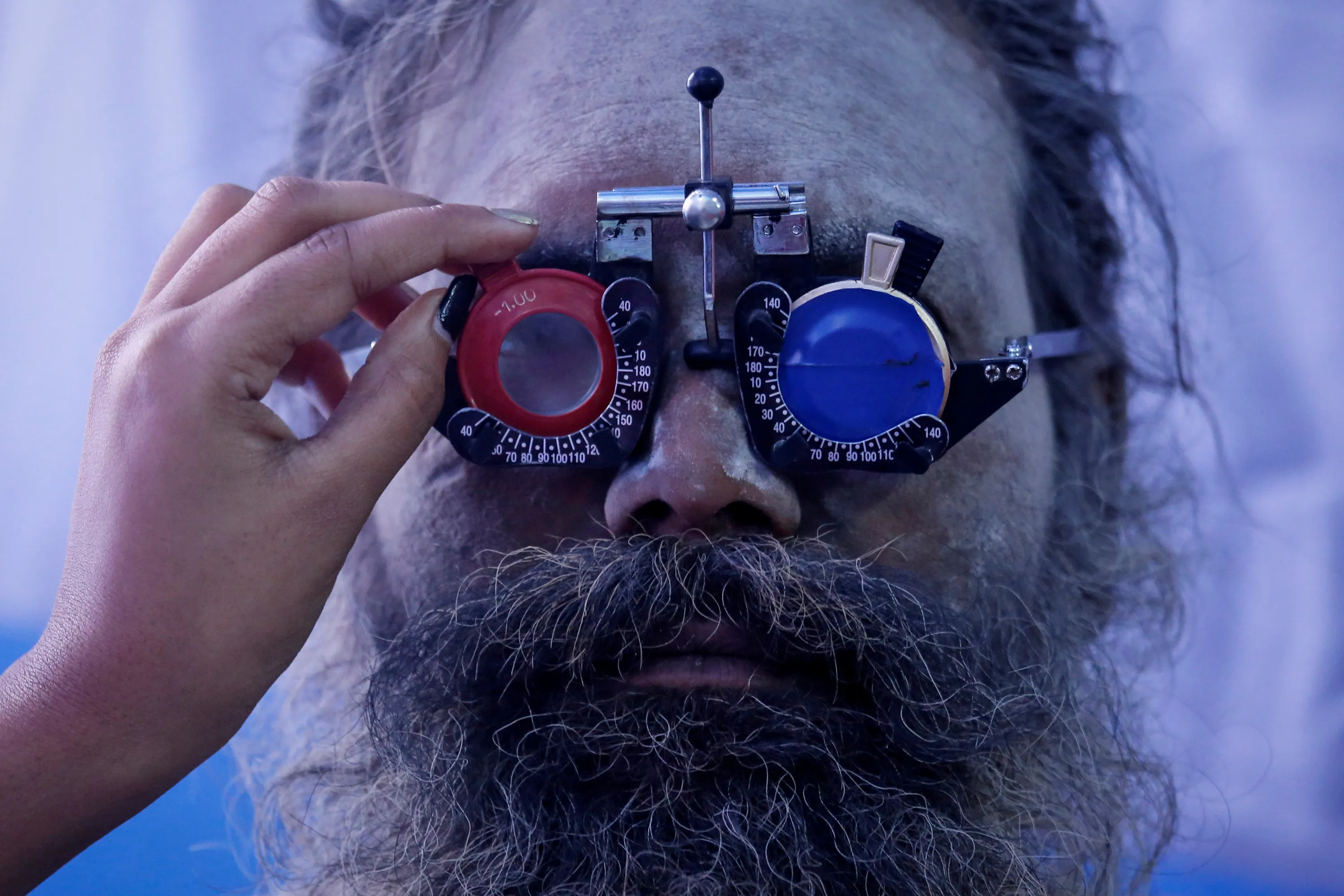 A Sadhu or a Hindu holy man gets his eyes tested at a free eye-care camp at a makeshift shelter before heading for an annual trip to Sagar Island for the one-day festival of “Makar Sankranti”, in Kolkata, India, January 10, 2019. (Photo by Rupak De Chowdhuri/Reuters)
