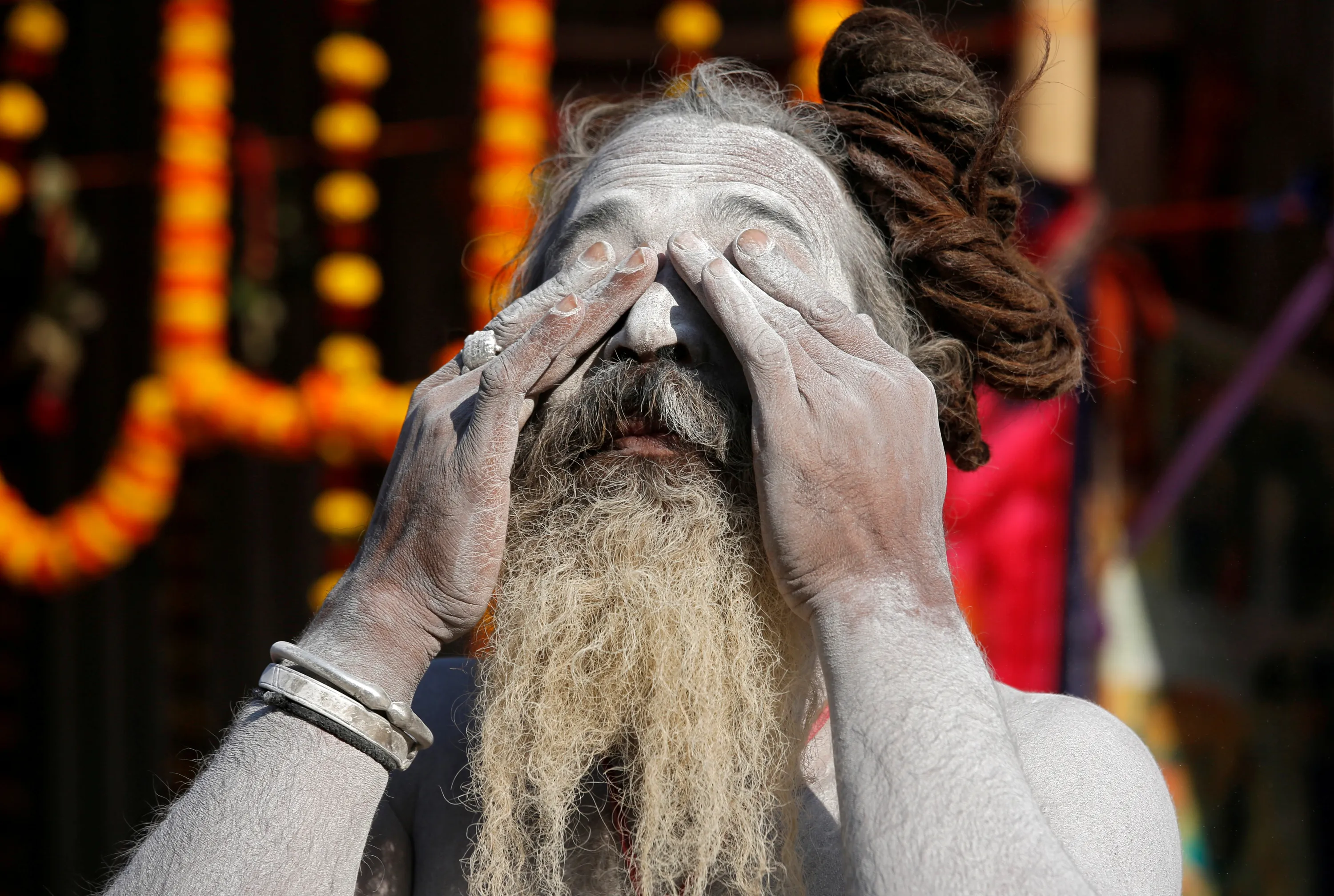 A Sadhu or a Hindu holy man applies ash on his face at a makeshift shelter before heading for an annual trip to Sagar Island for the one-day festival of “Makar Sankranti”, in Kolkata, India, January 7, 2019. (Photo by Rupak De Chowdhuri/Reuters)