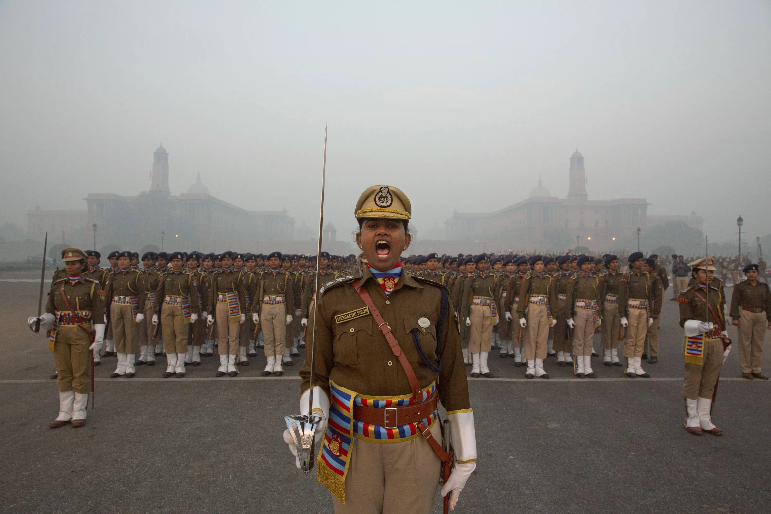 An Indian woman paramilitary officer shouts orders during Republic Day parade rehearsals in New Delhi, India, Tuesday, January 5, 2016. India marks Republic Day on Jan. 26 with military parades across the country. (Photo by Manish Swarup/AP Photo)
