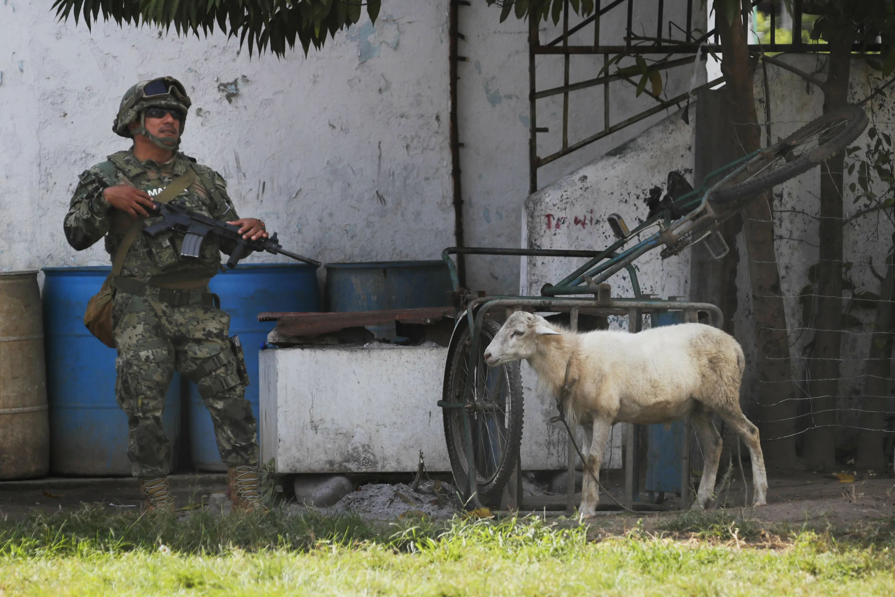 A Mexican marine stands guard inside the Plan Aleman stadium where a shelter for migrants is being prepared in Ciudad Hidalgo, Chiapas State, Mexico, Thursday, January 17, 2019. Hundreds of Central American migrants are walking and hitchhiking through the region as part of a new caravan of migrants hoping to reach the United States. (Photo by Marco Ugarte/AP Photo)