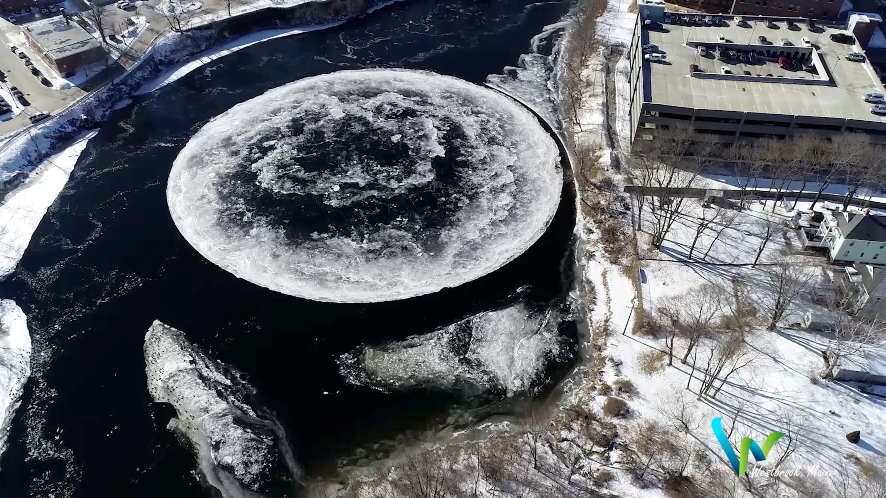A massive ice disc formed on the surface of Presumpscot River is seen in Westbrook, Maine, U.S., January 14, 2019 in this still image taken from a social media video obtained January 16, 2019. (Photo by Tina Radel via Reuters)