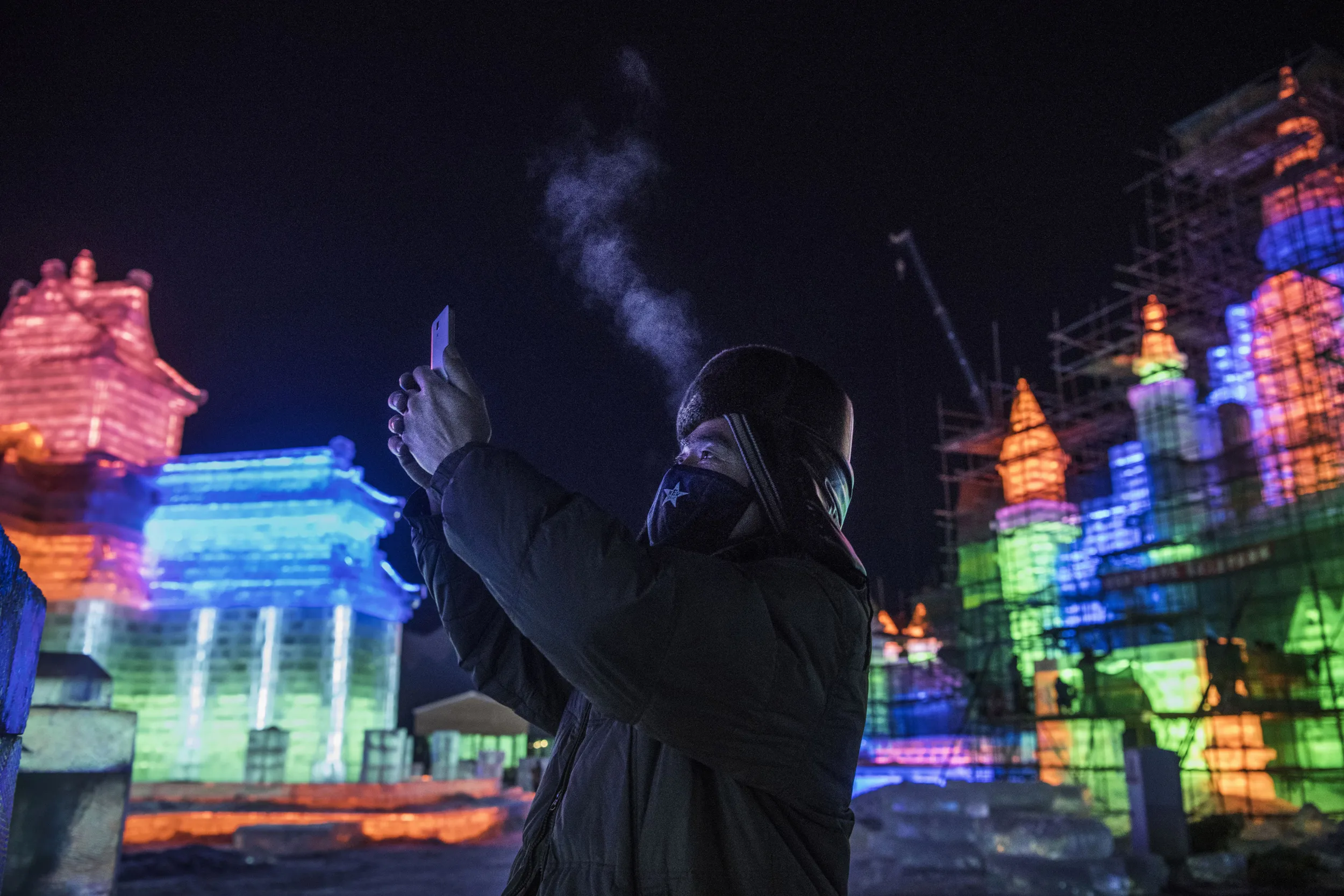 A Chinese worker takes a picture with his phone of ice sculptures he and others built in preparation for the Harbin Ice and Snow Festival on December 19, 2018 in Harbin, China. The annual winter festival, considered the worlds largest, officially opens January 5th, 2019, and runs for one month. The massive and detailed snow sculptures and full-sized illuminated ice buildings attract over a million visitors a year to the north-eastern city of Harbin, where the cold Siberian wind plunges the average temperature to -13 degrees Fahrenheit (-25 degrees Celcius). The elaborate ice buildings and intricately carved sculptures are made from blocks cut from the frozen Songhua River. For weeks before the festival, hired workers collect and transport nearly 200,000 cubic metres of ice to the site. Most of the cutters are farmers from nearby villages who start work before dawn at bitterly low temperatures to earn about $35 US per day. Blocks weighing up to 700 kilograms each are sculpted to different themes recreating animals and architectural wonders. Multi-colored lights give the structures a dazzling glow across the 750,000 square metre festival, which is marking its 35th year. (Photo by Kevin Frayer/Getty Images)