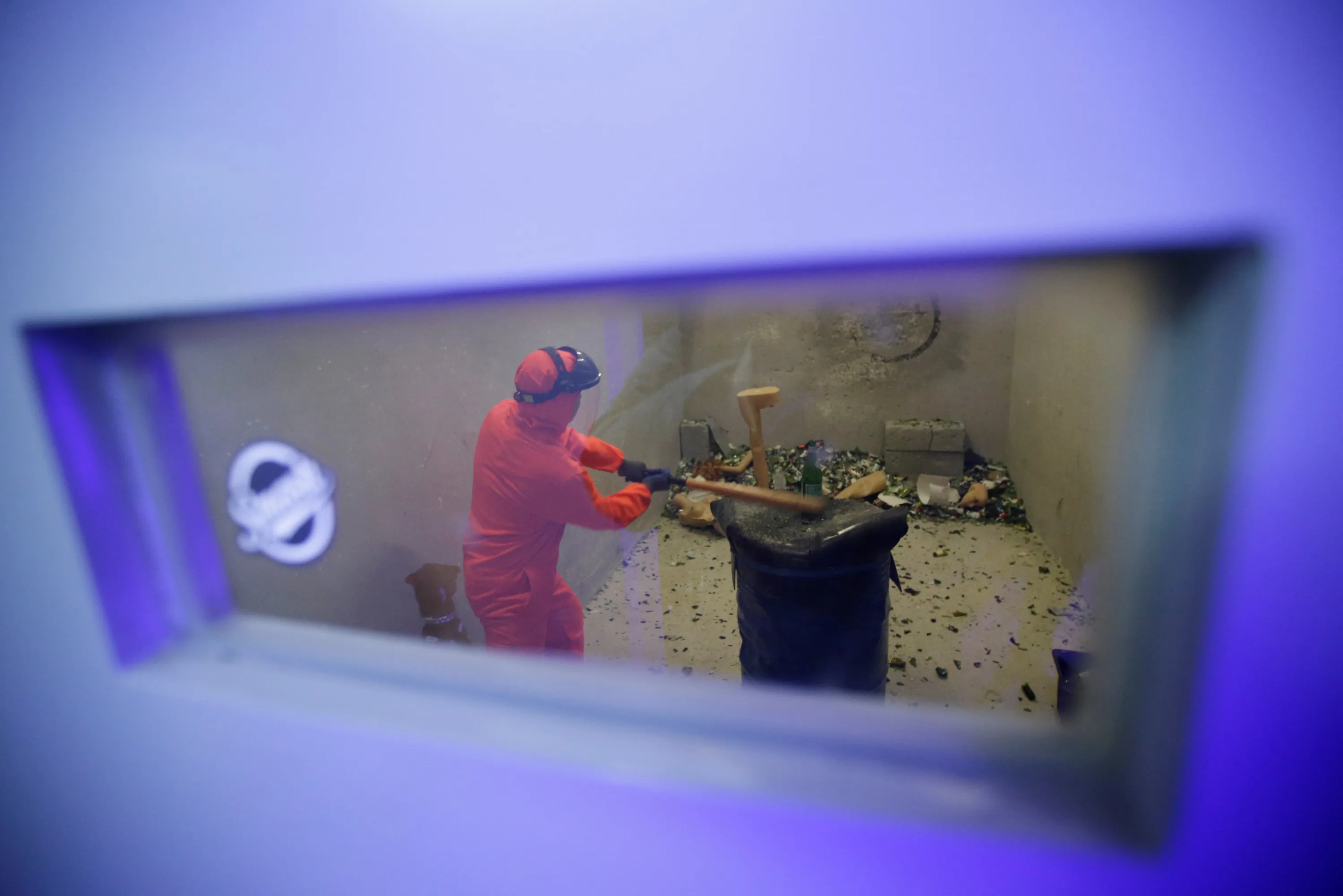 Customer Liu Chao, wearing protective gear, is seen through a window as he smashes bottles in an anger room in Beijing, China January 12, 2019. (Photo by Jason Lee/Reuters)