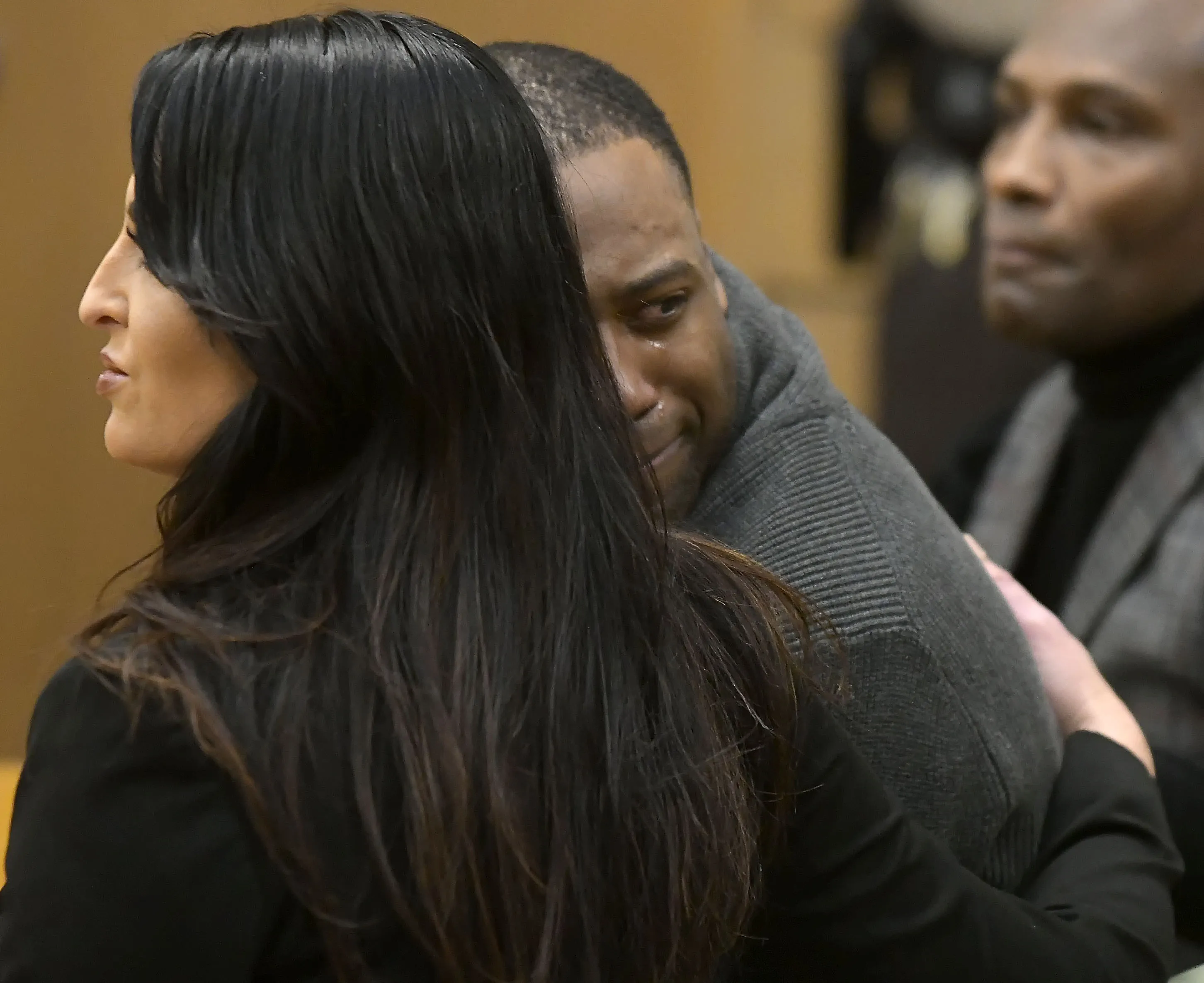 Torrey Green looks back at his family while being consoled by defense attorney Skye Lazaro, after a jury finds him guilty of eight charges including five counts of rape and a charge sexual battery in connection to reports from six women accusing him of sexual assault while he was a football player at Utah State University, Friday, January 18, 2019 in Brigham City, Utah. (Photo by Eli Lucero/Herald Journal via AP Photo)