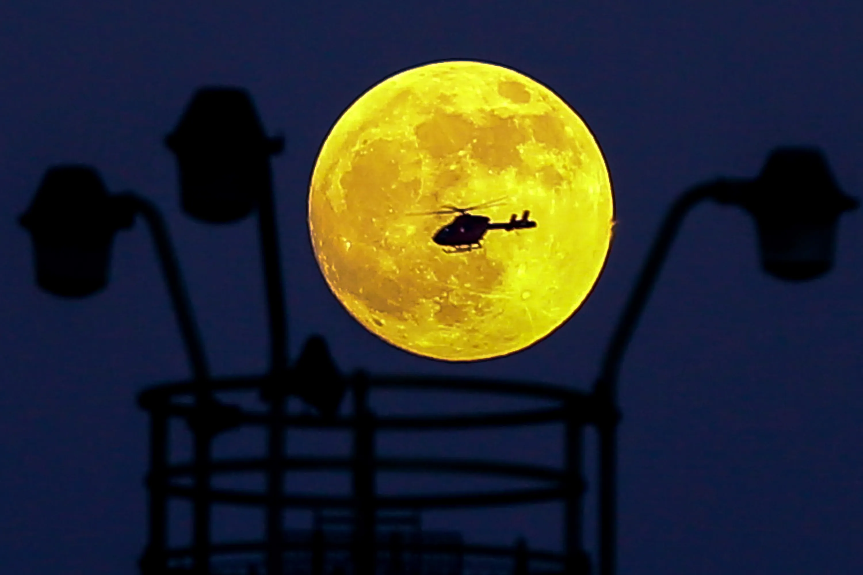 A helicopter flies in front of the Wolf Moon as it rises over London, England on January 20, 2019. The Wolf Moon, the Full Moon on January 20-21, 2019, is a Supermoon, making it look bigger and brighter than usual during the total lunar eclipse. (Photo by Dinendra Haria/Rex Features/Shutterstock)