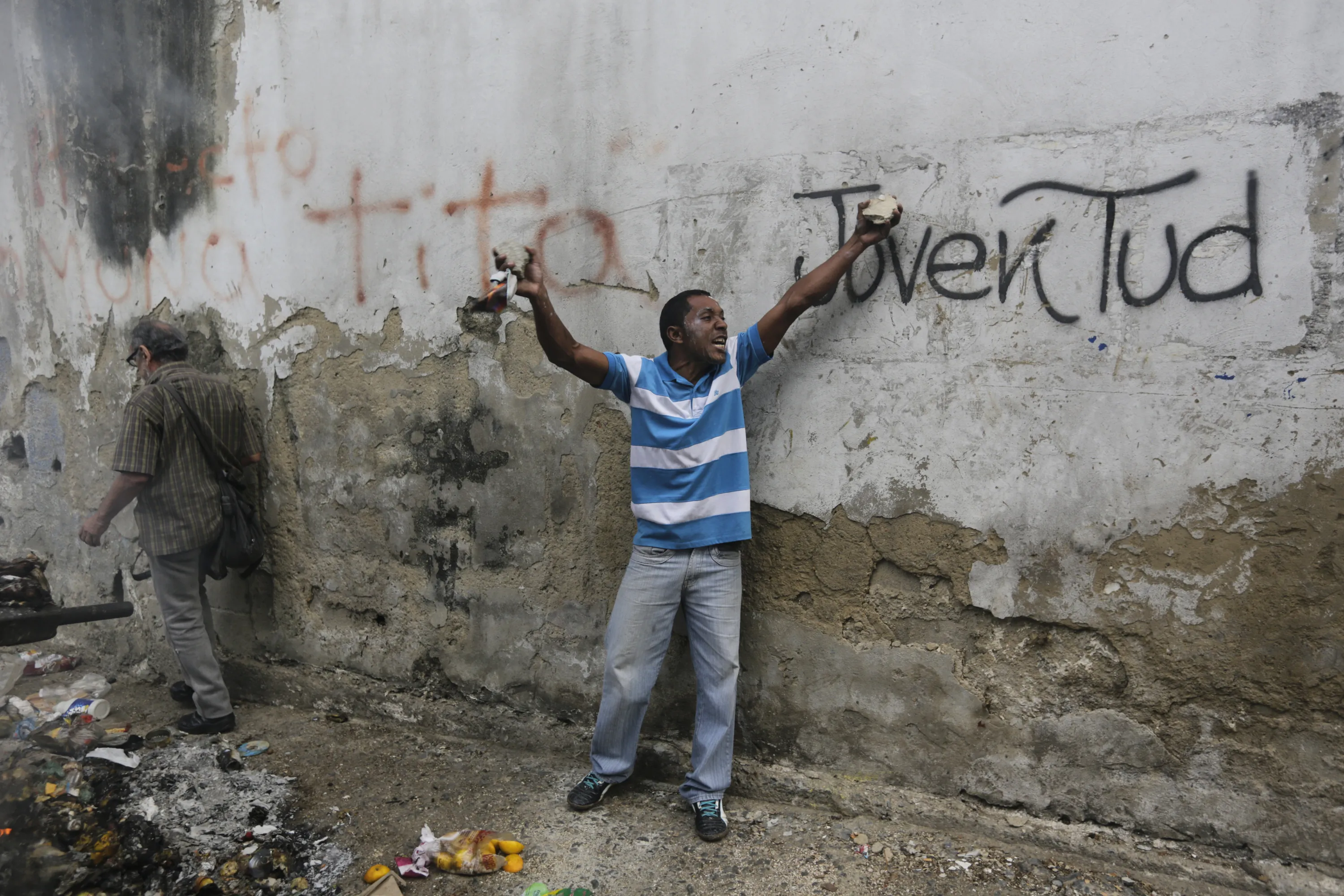 An anti-government protester yells during clashes with security forces as some residents show support for an apparent mutiny by a national guard unit in the Cotiza neighborhood of Caracas, Venezuela, Monday, January 21, 2019. (Photo by Fernando Llano/AP Photo)