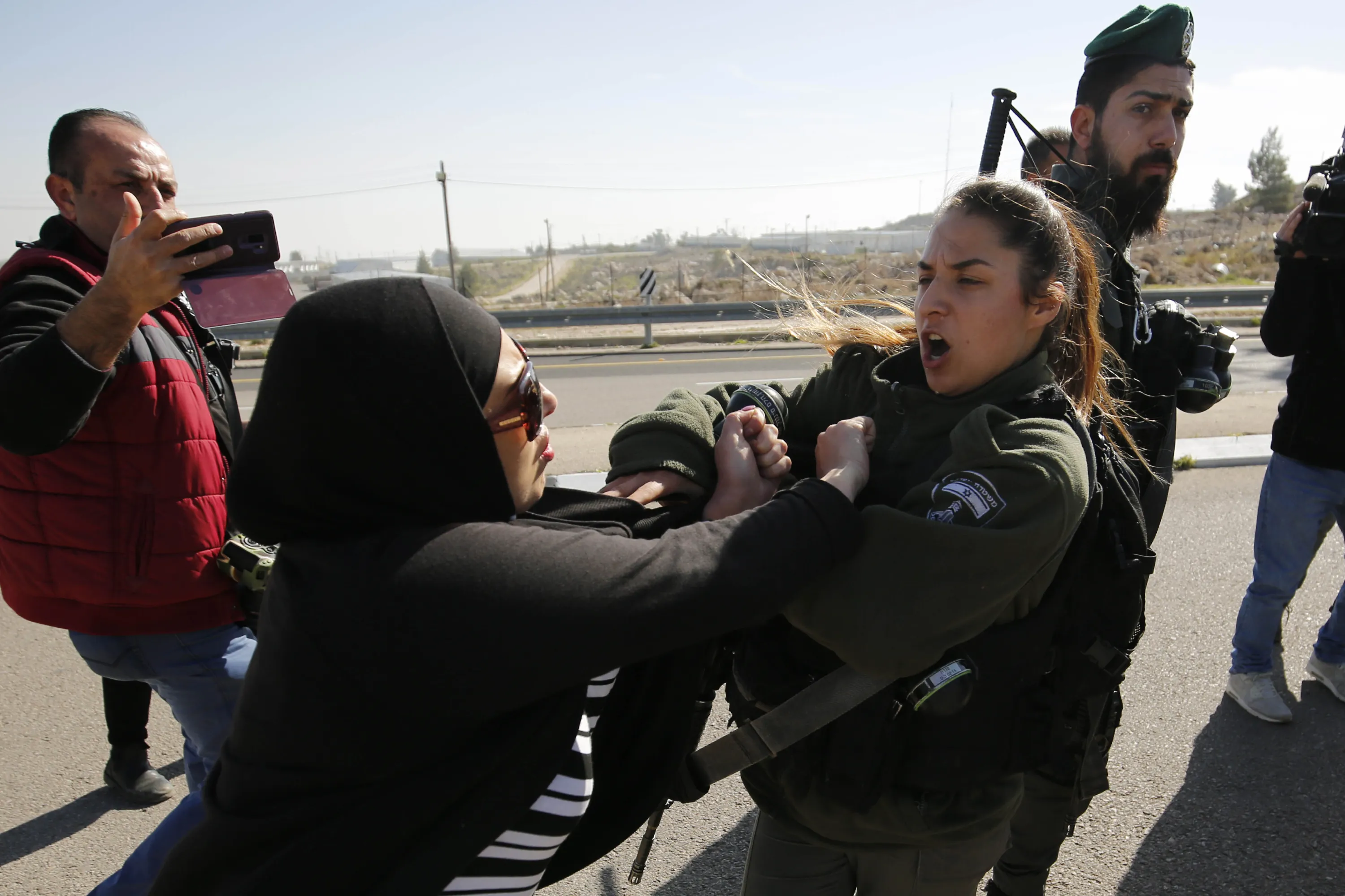 A protestor scuffles with an Israeli boder guard during a demonstration by Palestinian, Israeli and foreign protesters against the newly-opened Route 4370, on January 23, 2019, in the occupied West Bank. The highway into Jerusalem divides Israeli and Palestinian drivers into separate lanes with a wall, leading Palestinians to label it an “apartheid road”. Its western side serves Palestinians, who cannot enter Jerusalem, whereas the road’s eastern side serves settlers, who can now reach northern Jerusalem. (Photo by /AFP Photo)