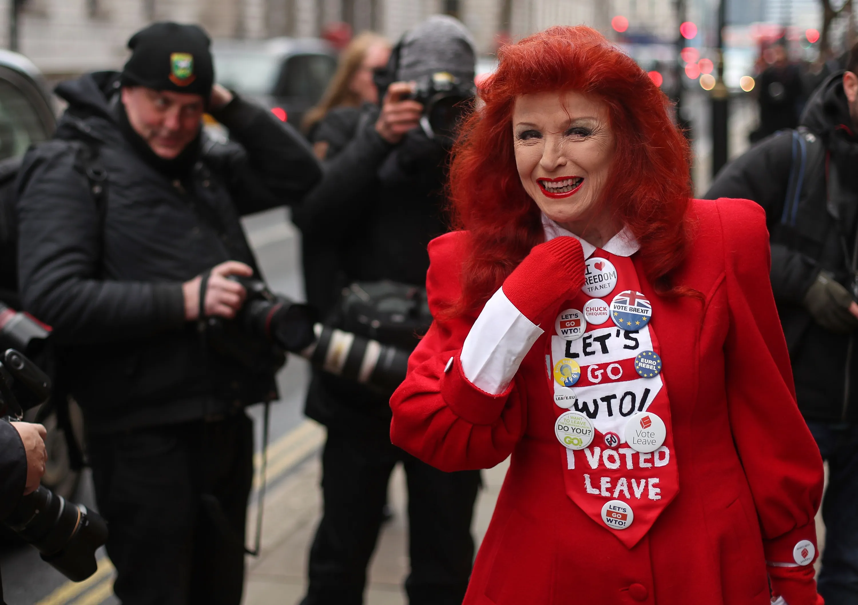 A pro-Brexit protester wearing “I Voted Leave” and other slogans on her tie poses for a photograph in London on January 23, 2019. British MPs frustrated with Prime Minister Theresa May's Brexit strategy are seeking to force a new approach, which could include delaying Britain's exit from the EU and holding a second referendum. (Photo by Daniel Leal-Olivas/AFP Photo)
