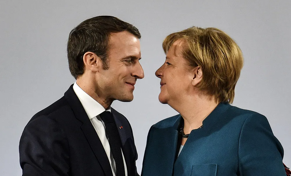 German Chancellor Angela Merkel watches French President Emmanuel Macron after the signing of a new Germany-France friendship treaty at the historic Town Hall in Aachen, Germany, Tuesday, January 22, 2019. The new Treaty of Aachen is the succession of the 1963 Elysee Treaty signed by West German Chancellor Konrad Adenauer and the then French President Charles de Gaulle. (Photo by Martin Meissner/AP Photo)