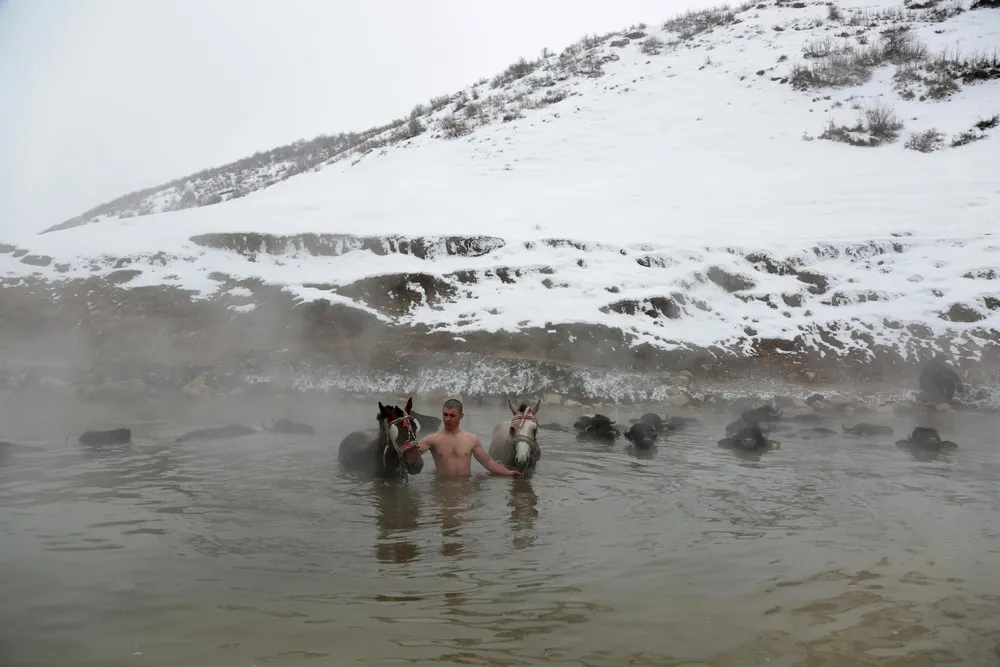 A villager escorts horses as they bathe in a natural hot spring at a snow-covered valley in the eastern Bitlis province, Turkey on January 22, 2019. (Photo by Sertac Kayar/Reuters)