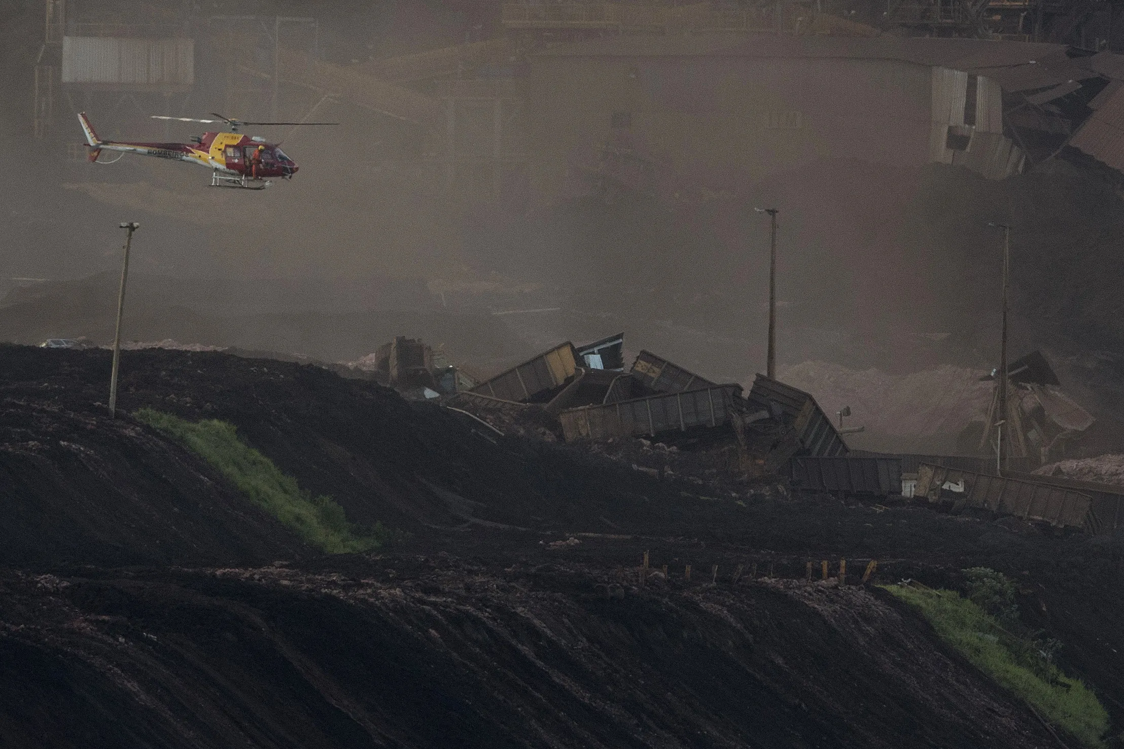 A firefighter helicopter flies over destroyed wagons at the site where a dam collapse two days prior, next to dam B6 that was at risk of breach too, in Brumadinho, Brazil, Sunday, January 27, 2019. Authorities evacuated several neighborhoods in the southeastern city of Brumadinho that were within range of the B6 dam owned by the Brazilian mining company Vale. (Photo by Leo Correa/AP Photo)