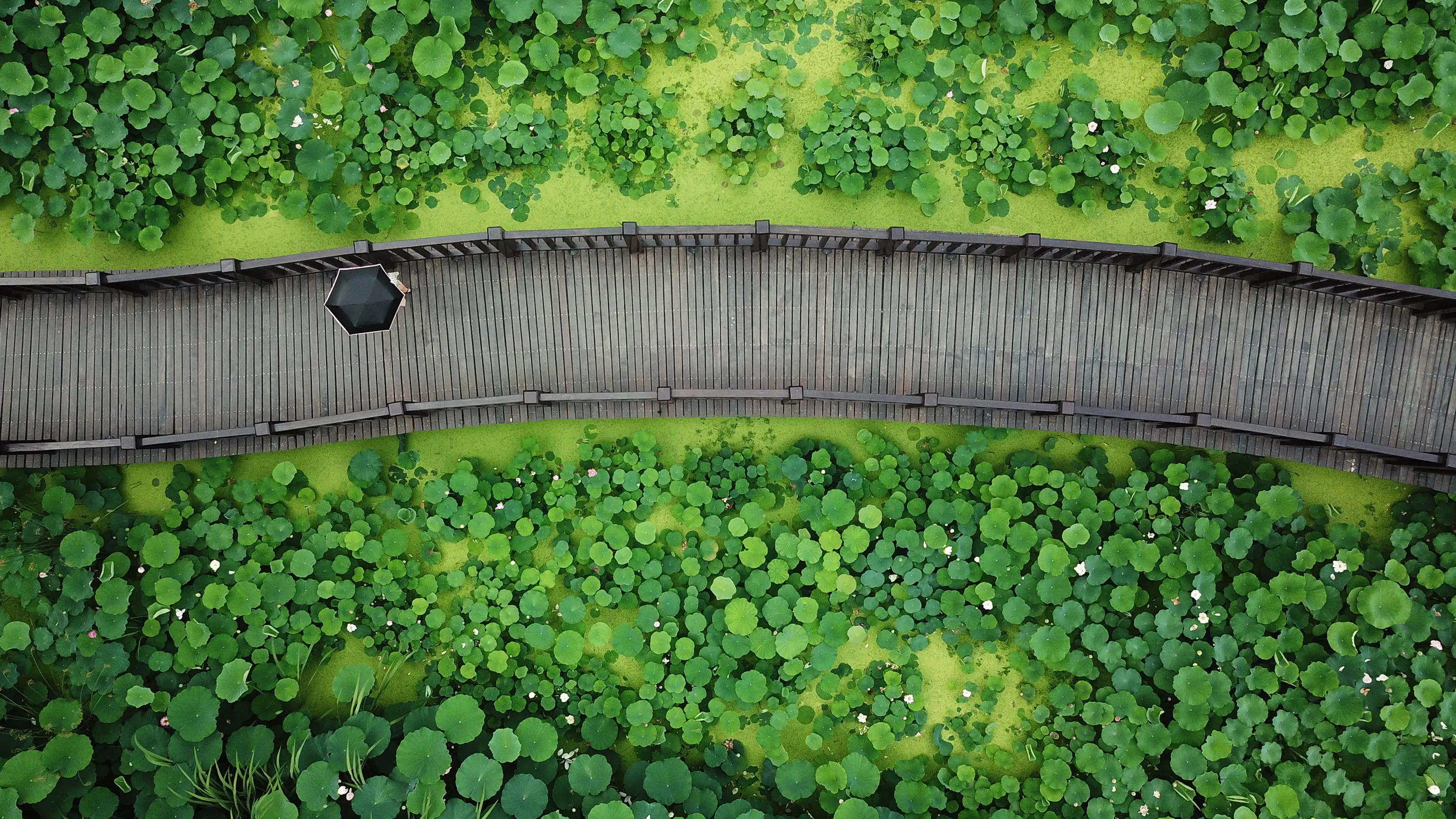 This aerial photo taken on June 25, 2018 shows a person walking with an umbrella along a path through lotus flowers in Yangzhou in China's eastern Jiangsu province. (Photo by AFP Photo/Stringer)