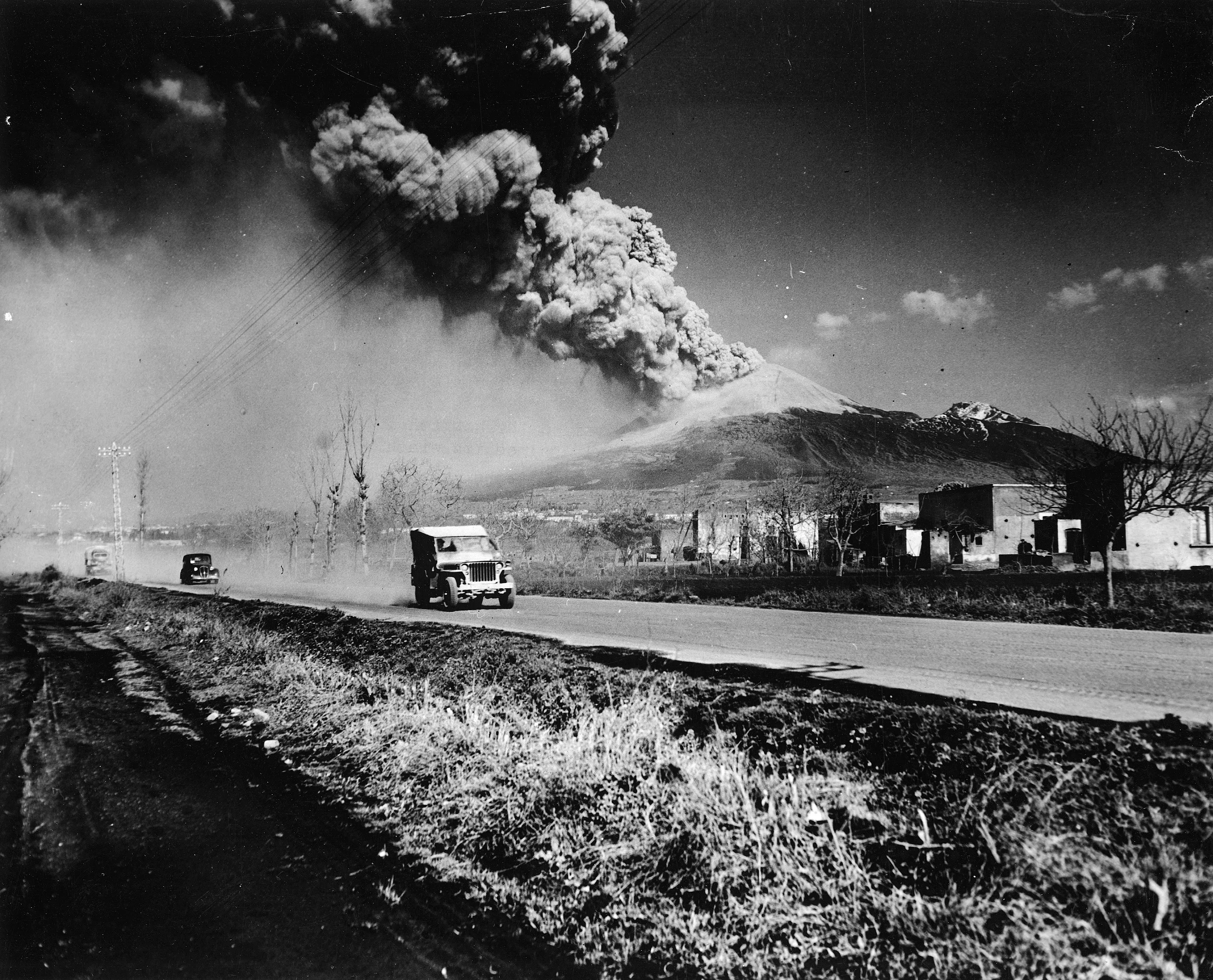 With Mt. Vesuvius smoking and spewing ash in the background, an Army jeep is seen speeding away from the inferno, as the volcano erupts shortly after the arrival of the Allied forces in Naples, on March 17, 1944. (Photo by AP Photo)